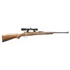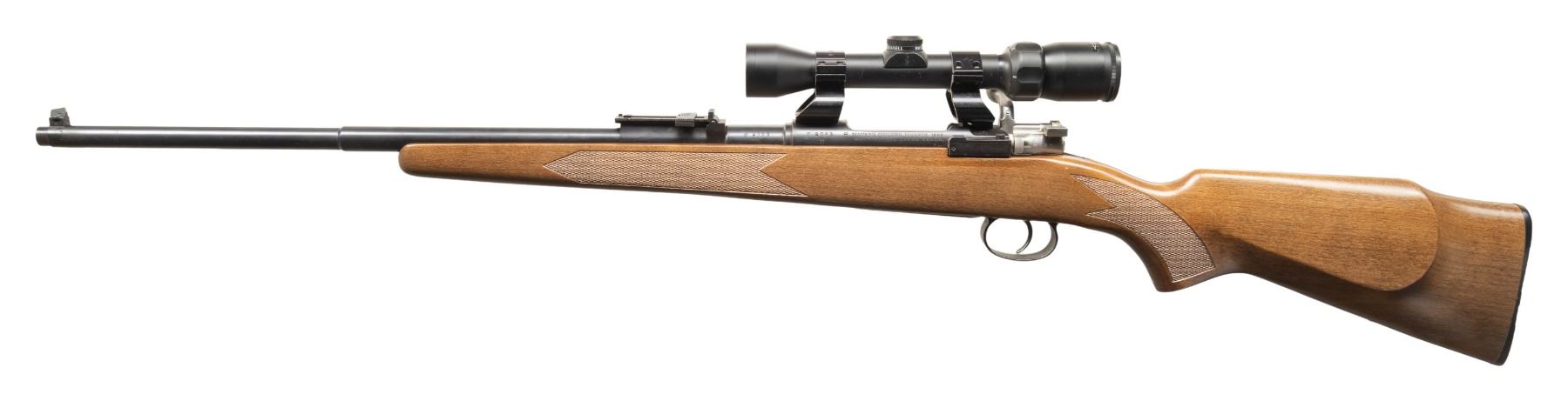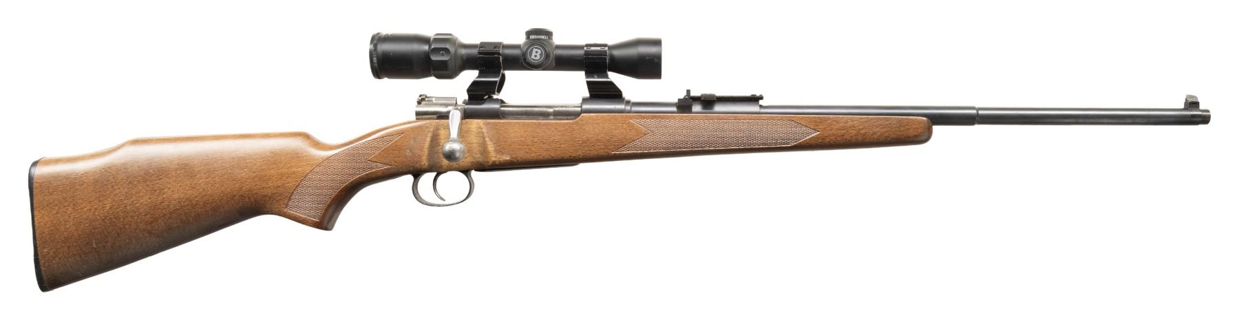 RIFLE. Cal. 7mm Mauser. S# F2063. Bbl. 22". Blade front sight with added white paint. Ladder rear sight graduated to 2000m. Receiver Mounted Bushnell Banner 1.75-4x power scope. Scope has crosshair reticle with dot center & very good optics. Matte blue finish. Altered & turned down bolt handle. Checkered walnut stock with raised cheekpiece, crudely added bolt cutout & holes for sling studs. CONDITION: stock shows some finish loss in & around bolt cutdown & scattered handling marks. Metal retains 92% dull blue with scattered handling marks, edge wear, fading & light oxidation. Action functions properly when hand cycled. Very good bright bore with some light frosting. (01-28765/MJC). ANTIQUE. $200-400.