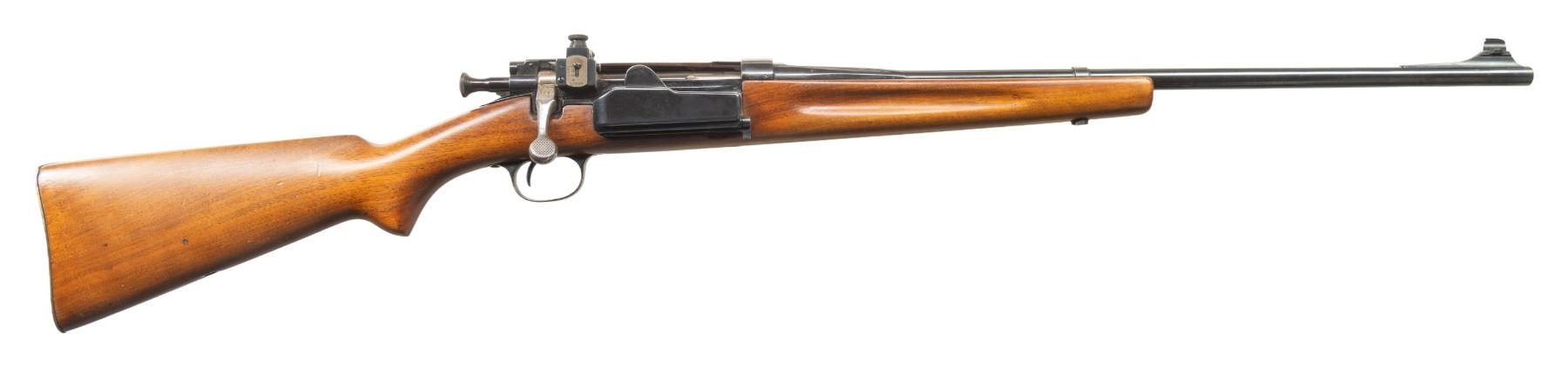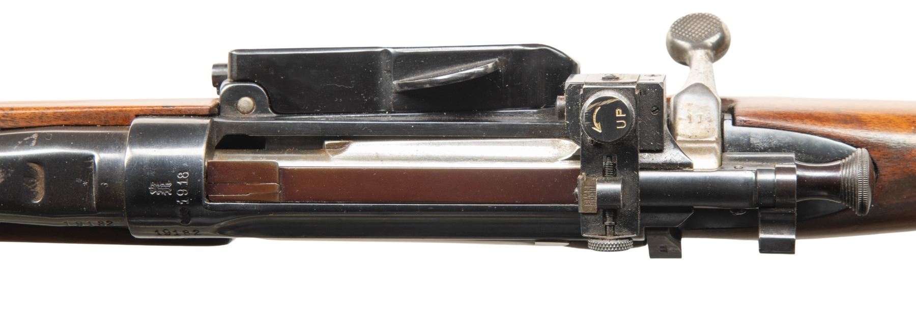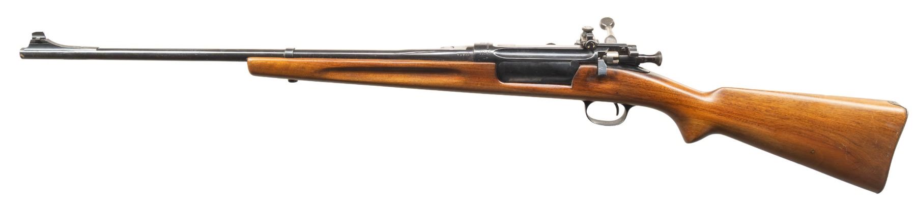 Cal. 6.5x55. S# 19182. Bbl. 22". Ramped white bead front sight. Lyman aperture rear sight. Matching numbers on bolt & receiver. Other parts mismatched or unnumbered. 1918 dated receiver. Commercial reblue finish. Shortened hardwood stock with bottom mounted sling stud holes. CONDITION: sanded stock has added finish with a plugged round hole on toeline, some dings, staining & handling marks. Metal retains 95% reblue with some oxidation spots, edge wear & handling marks. Action functions properly when hand cycled. Dark poor bore with visible rifling but pitting & oxidation. PROVENANCE: Estate of Groves Herrick. (25-5642/MJC). MODERN. $200-300.