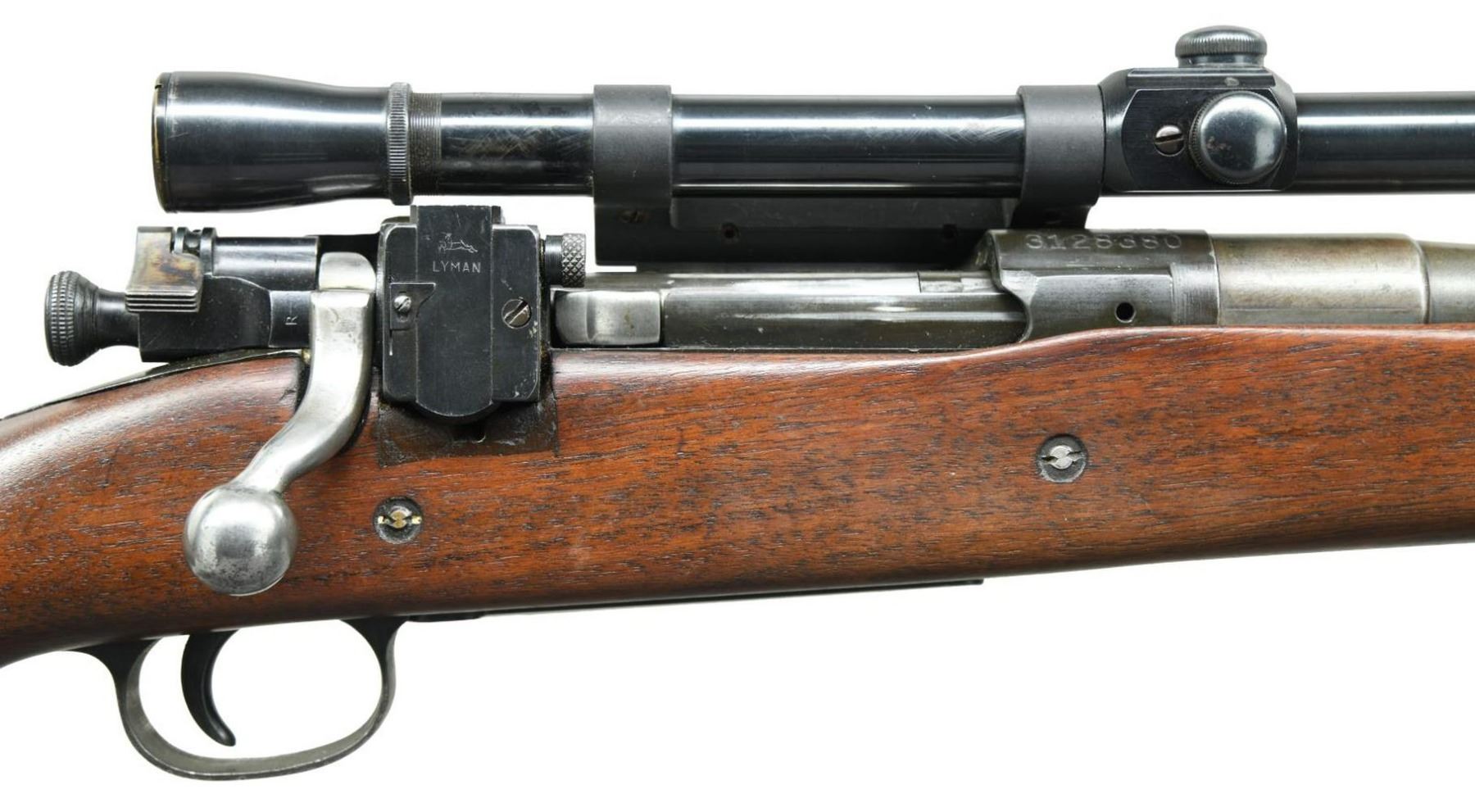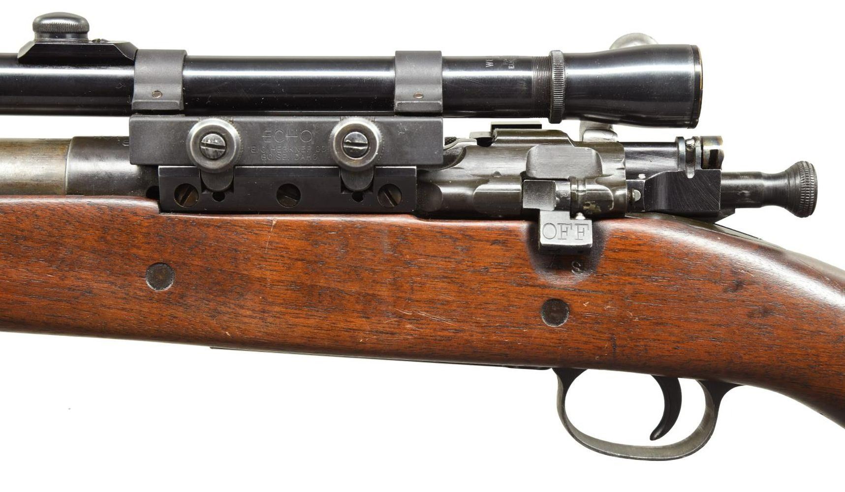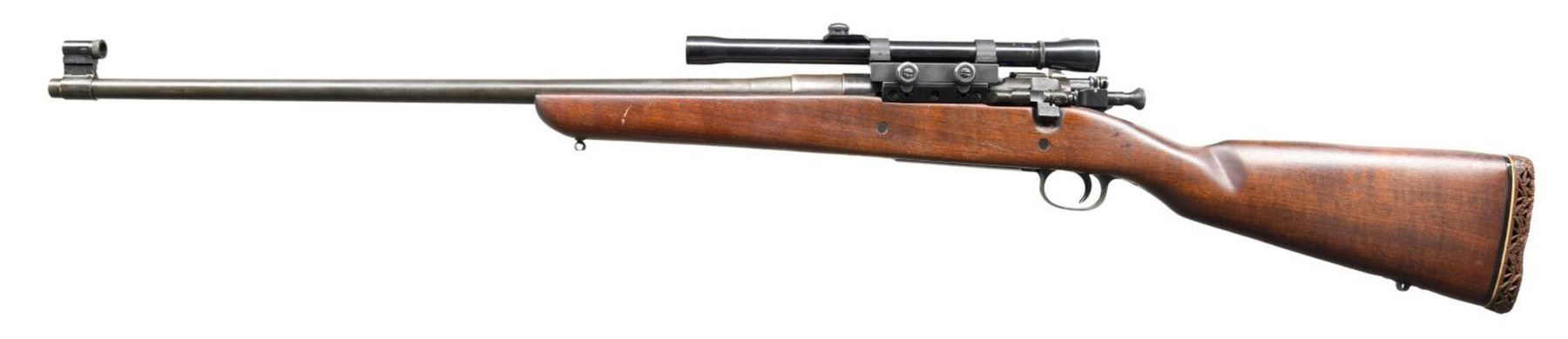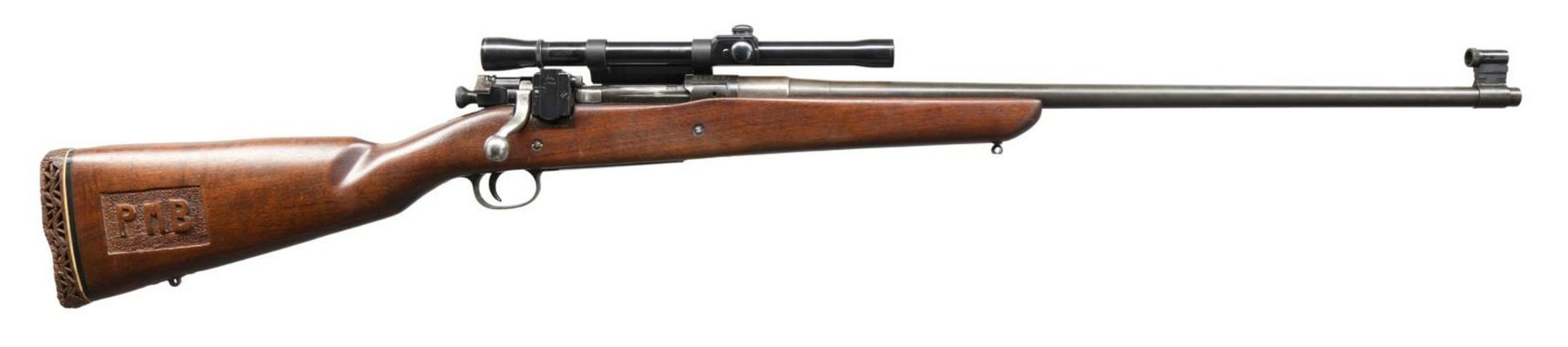 RIFLE. Cal. 30-06. S# 3128380. Bbl. 24". Originally manufactured as a standard Model 1903 rifle by Remington, this example was subsequently sporterized via the shortening/modification of the stock, addition of a side mounted scope rail, as well as the addition of a Lyman adjustable aperture rear sight and Lyman globe front sight. The receiver is marked "U.S./ REMINGTON/ MODEL 1903" above the S#. Right side of buttstock exhibits a carved out rectangular panel, with "PMB" relief carved inside. "5-42" dated Rock Island Arsenal bbl. ECHO side mount is fitted with a Weaver J4 scope. Bolt has been modified, having been turned down and swept back. CONDITION: good, with metal components retaining large amounts of their parkerized finish, exhibiting areas of wear and thinning overall that show through to gray patina. Bright bore, exhibiting consistent light pitting and strong rifling throughout. Stock shows some scattered marks from handling and storage, but otherwise remains sturdy and serviceable. Red rubber recoil pad has hardened and exhibits cracking overall. Optic is cloudy. (23-5145/MLW). MODERN. $250-350.