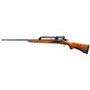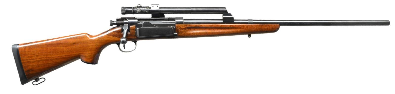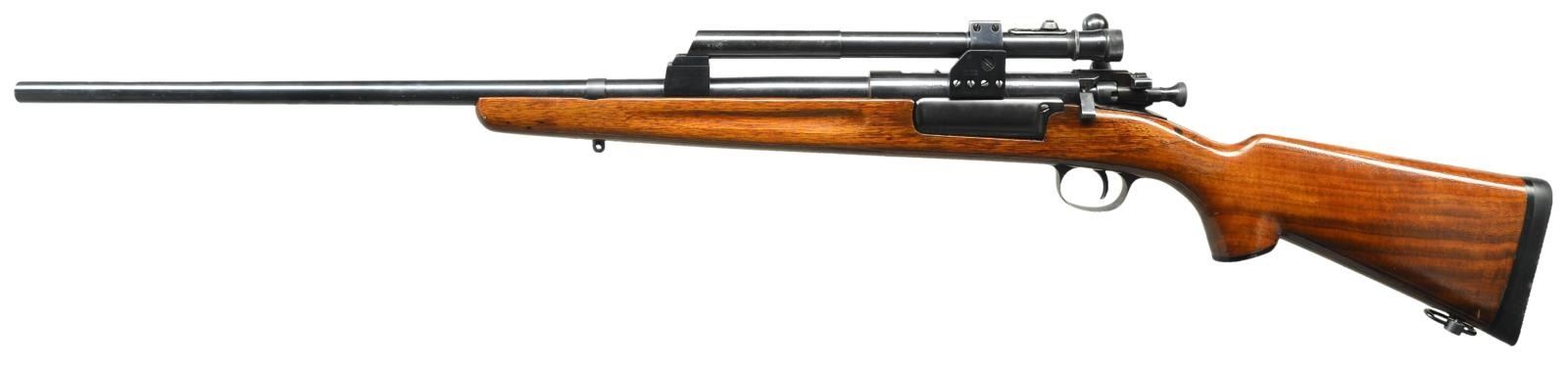 Cal. 30-40 Krag. S# 64832. Bbl. shortened to 24" w/ filler screws for rear sight base. Left side receiver rail has 4 drilled & tapped holes for M. L. Stith base along w/ base installed on bbl. Bases are holding a 11" length W.R. Weaver Model 330 El Paso, Texas 3/4" scope w/ fine crosshair reticle. 2 Piece walnut stock attached by 3 wood plugs around upper tang & 4 wood plugs around trigger guard. Forearm appears altered from rifle w/ band attaching forearm to bbl., finger grooves & sling stud. Pistol grip buttstock w/ black plastic grip cap, sling swivel & Browning black recoil pad. CONDITION: very good overall as refinish. Reblued metal has pinprick oxidation & light handling marks. Trigger guard shows thin blue w/ light marks. Sanded & refinished wood has lg crack running through stock splice around top tang w/ light handling marks. Good bore w/ light pitting. Scope has very good exterior finish w/ cloudy optics. (01-20591/MD). ANTIQUE. $300-500.