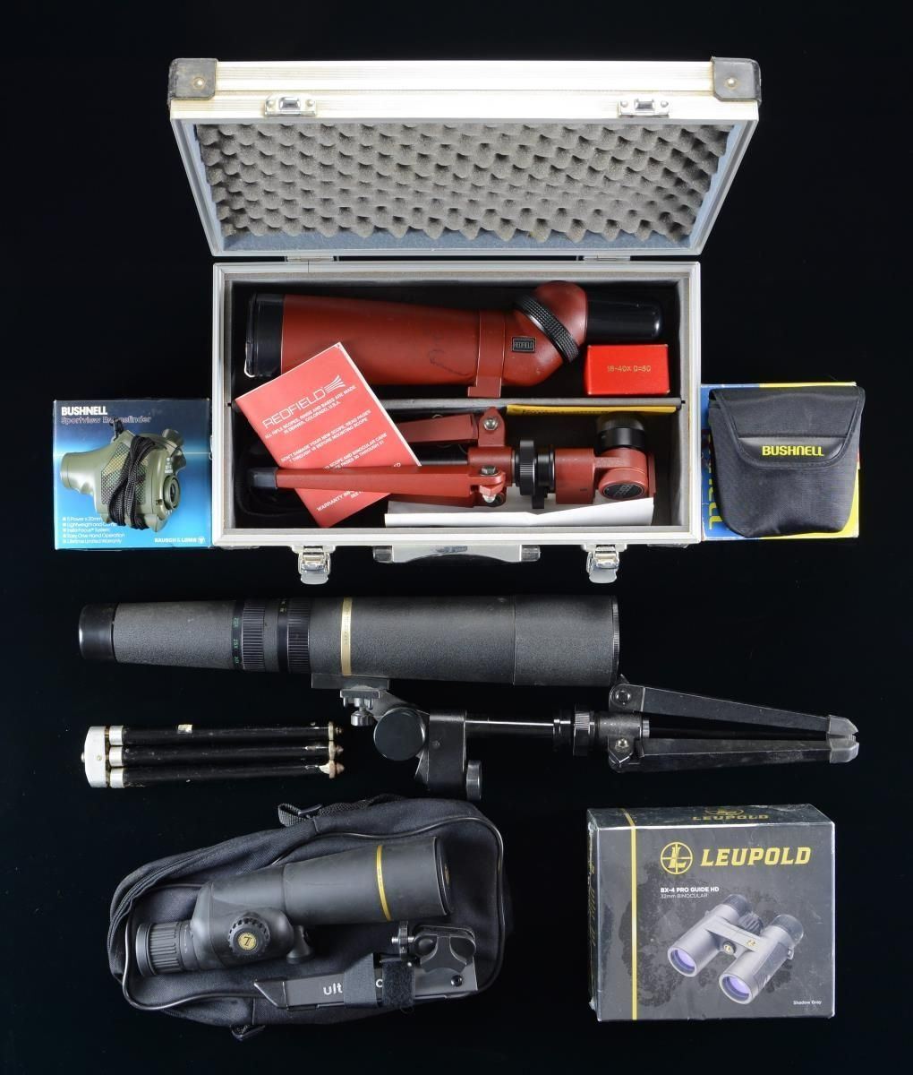 This lot consists of three spotting scopes, one spare tripod, a Rangefinder & two binoculars. 1. LEUPOLD COMPACT 15-30X50MM SPOTTING SCOPE. Scope caps, carrying case, small tripod, manual & carry strap all present. CONDITION: very good clear optics. Exterior shows scattered scuffing & some light scratches. 2. BAUSCH & LOMB DISCOVERER ZOOM 15-60X TELESCOPE. Small Redfield tripod & scope caps present. CONDITION: very good clear optics. Exterior shows light handling wear. 3. REDFIELD 18-40X SPOTTING SCOPE. Scope caps, carrying case, carry strap, keys, tripod & paperwork present. CONDITION: very good clear optics. Exterior shows some flaking & scuffing. 4. UNMARKED TRIPOD. Tripod has black painted legs w/ bright fittings. CONDITION: paint shows scattered flaking & staining. Other parts show scattered oxidation. 5. BUSHNESLL SPORTVIEW RANGEFINER. Rangefinder gives accurate distances from 25 to 125 yards. Box, rag, camoflauge carrying case, scope cap & manual present. CONDITION: very good optics. Exterior shows light handling wear. 6. LEUPOLD BX-4 PRO GUIDE HD 32MM BINOCULARS. 10x42 binoculars sealed in factory box. CONDITION: near new in box. 7. BUSHNELL 8X25 COMPACT BINOCULARS. Original box, rag, scope caps, carrying case & paperwork present. CONDITION: very good clear optics. Exterior exhibits some sticky adhesive staining. (02-20000/MJC). $200-300.