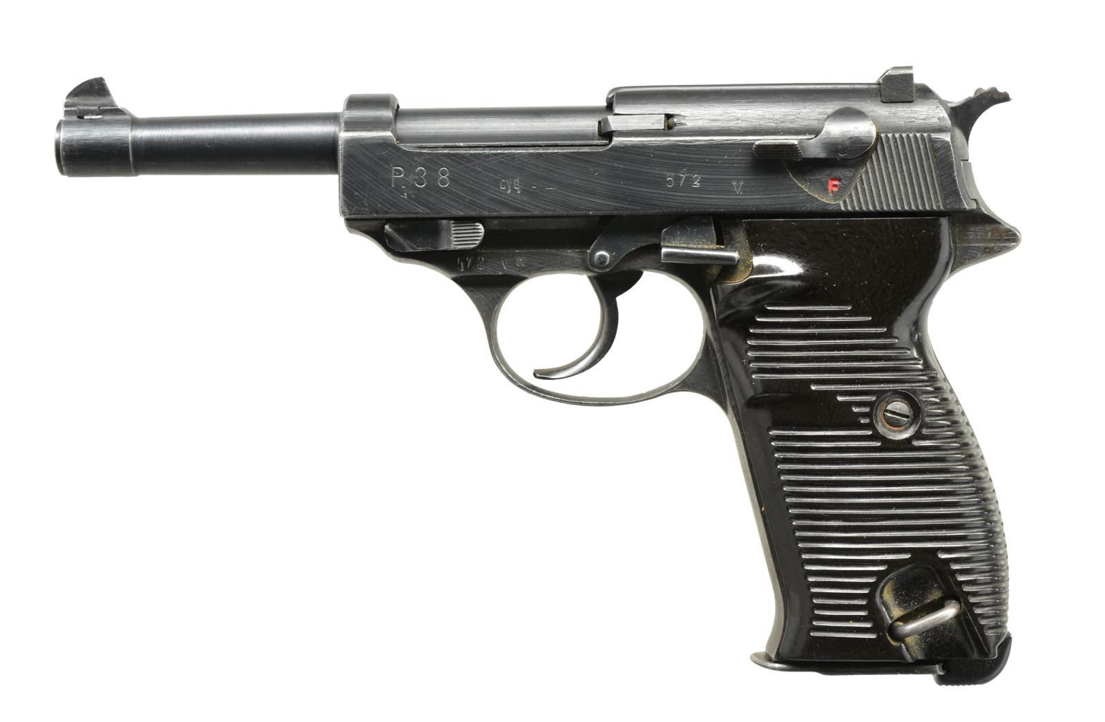 Cal. 9 mm Luger. S#572v. Bbl. 5". Standard wartime issue example w/ eagle 88 proofs plus matching numbered frame, slide, bbl. & locking block. Horizontally grooved chocolate brown bakelite grips. MAGS: 2 good factory 8 rd.: 1 w/ eagle 88 at base of spine; 1 w/ oxidized & distorted base having WaA135 on spine plus P. 38 on left side near base. CONDITION: missing locking block retaining spring. Very good overall appearance w/ occasional faint spots of peppery oxidation, holster like high point wear & thinning on front strap. Very good bore & near excellent grips. (21-3174/NW). CURIO. $450-600.