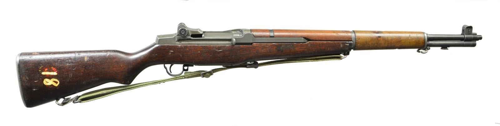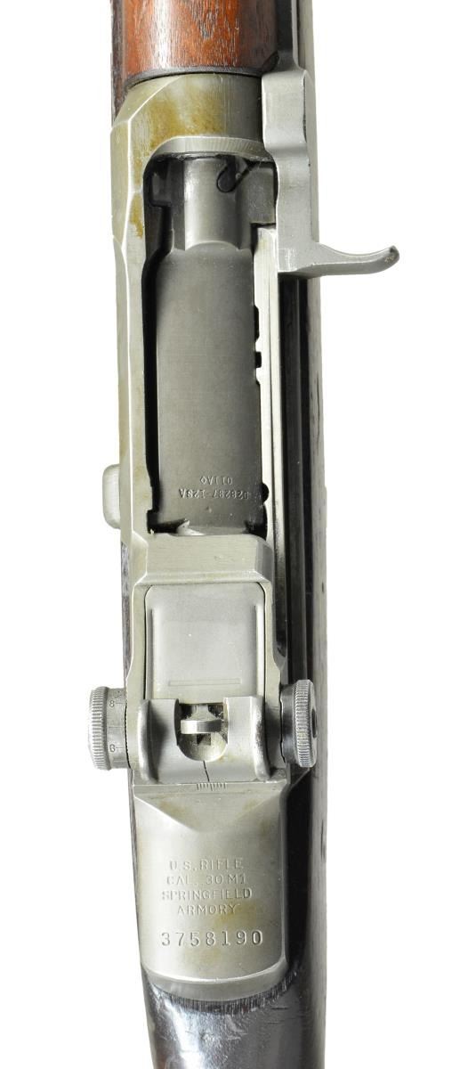 Cal. 30-06. S# 3758190. The 24" barrel by LMR is dated 12/53. Action with Springfield markings at rear has "SA" marked bolt. Trigger group with stamped guard, hammer and operating rod are all "SA" marked. Stock with leather sling is unmarked except for painted rack number "18" on right side. CONDITION: good as arsenal refinished. Metal parts retaining nearly all reparkerized finish. Stocks with old original finish with numerous marks and bumps. Bright shiny bore gauges .5(1/2) at throat, 1 at muzzle. Mechanically good. This should be a great shooter. PROVENANCE: From the estate collection of Charles P. Obremski. (22-1321/MGM). CURIO. $800-1,500.