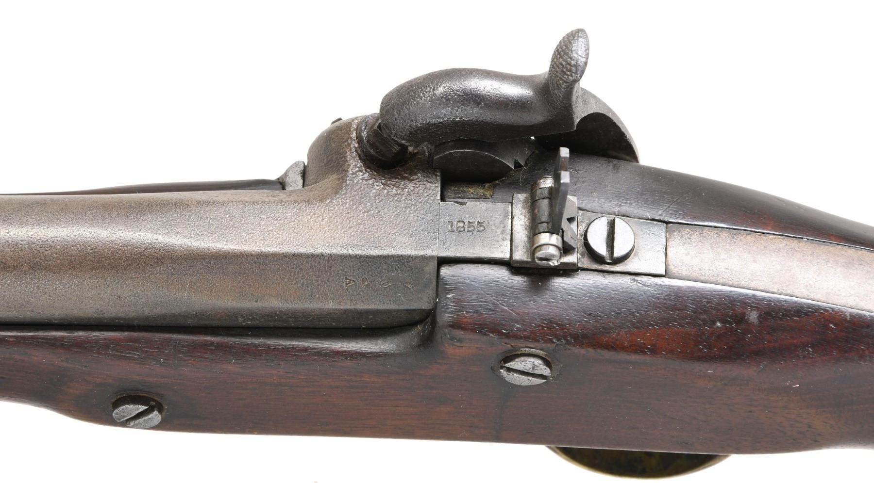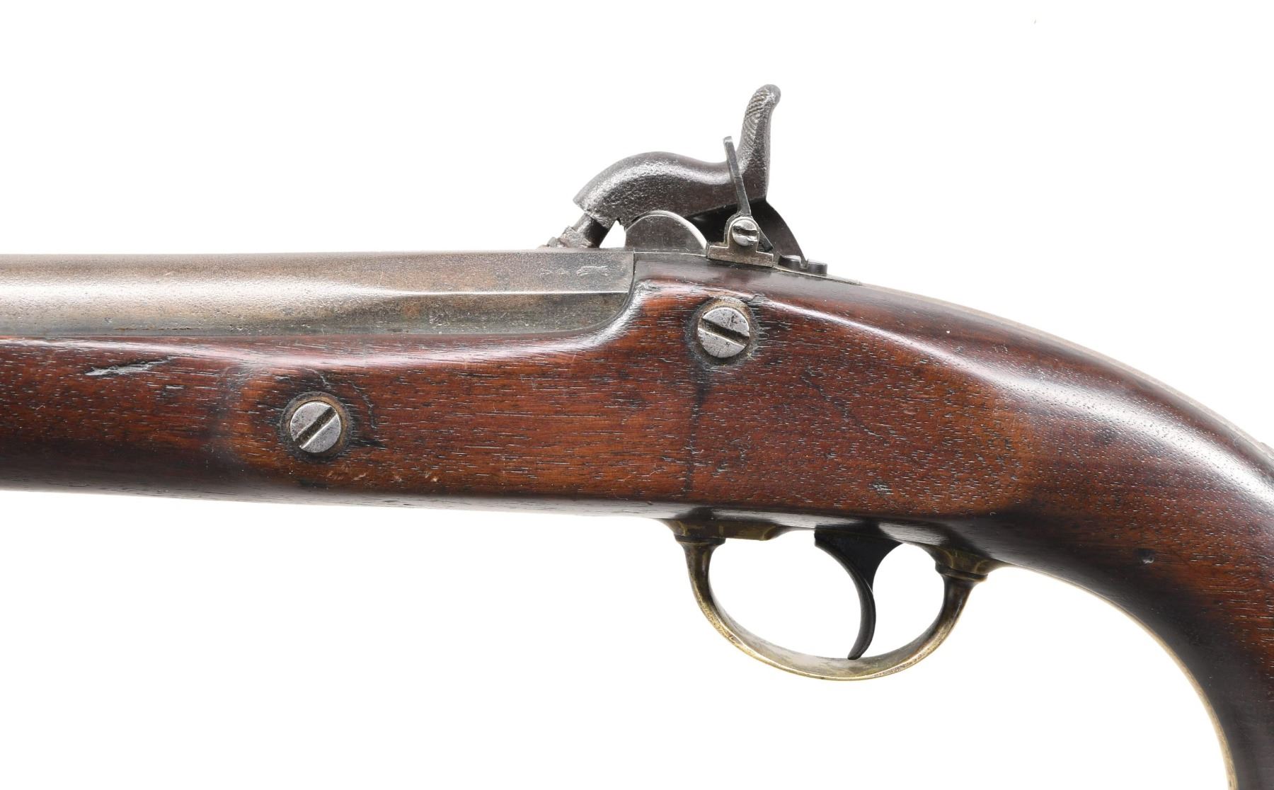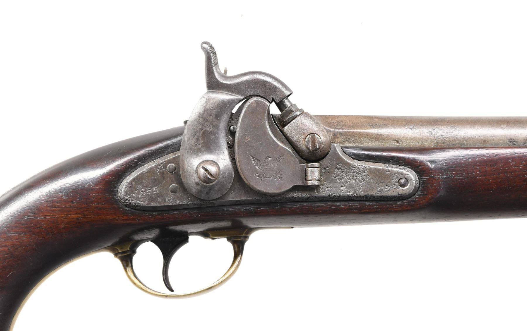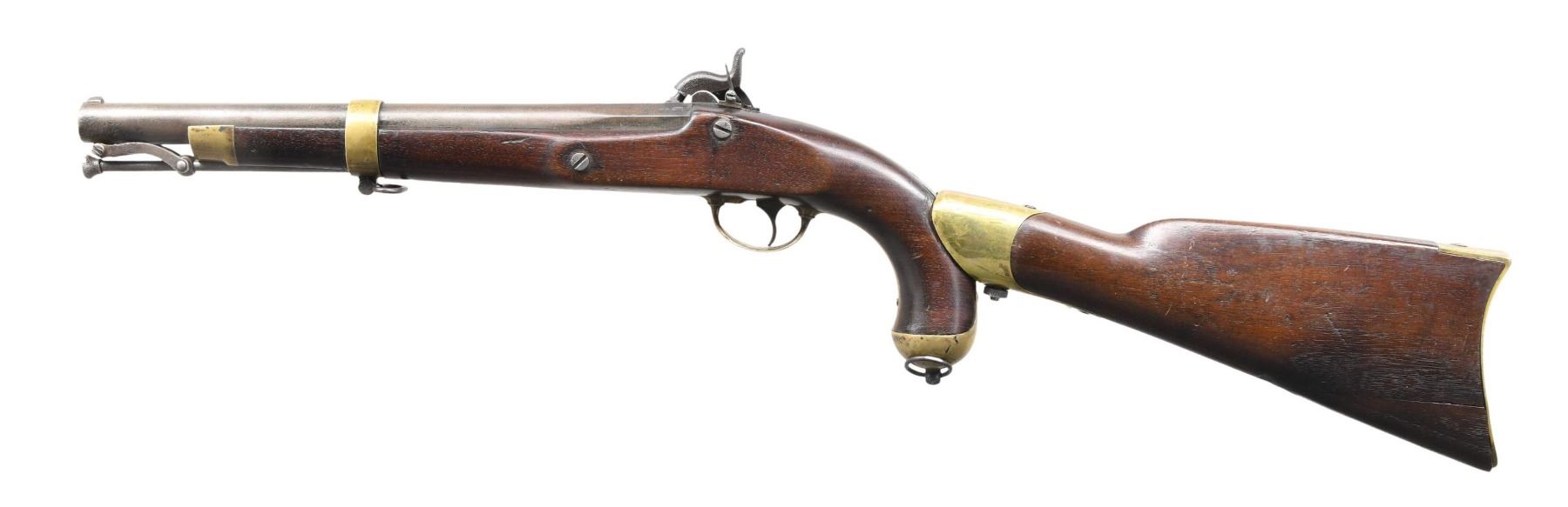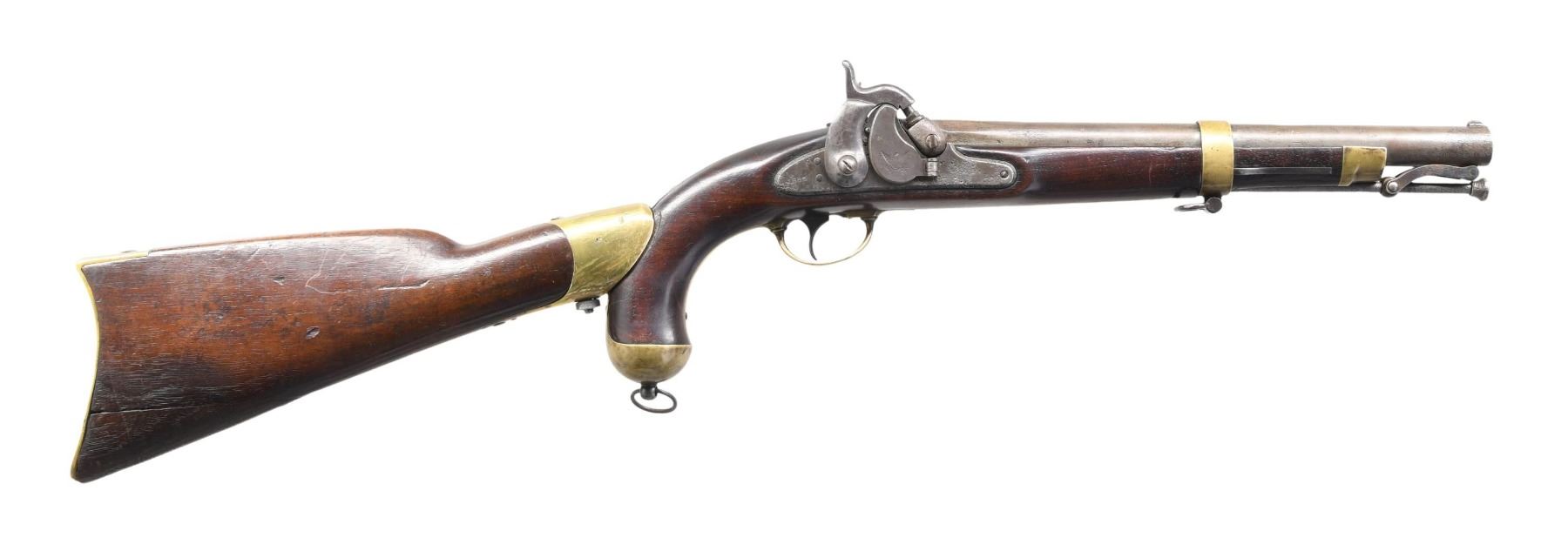 Cal. 58. NSN. Bbl. 12" w/ smooth bore & faceted breech. Barleycorn front sight w/ folding peep rear sight. Bbl. & lock are dated 1855. Lock is fitted w/ the Maynard self-priming device. Band fastened walnut stock w/ brass fittings, sling swivels & button tipped swivel ramrod. Includes a detachable walnut shoulder stock w/ brass fittings. Total of 4,021 mfg. 1855-57. CONDITION: metal finish has faded gray appearance w/ scattered pitting. Pistol & shoulder stock have lightly cleaned brass. Refinished stock shows dents & handling marks. Toe of shoulder stock has a 4" break w/ nail repair at toe. Stock attachment bolt & nut are replacement. Sound lock & primer feed mechanism. Lightly pitted bore. PROVENANCE: From the Collection of a Tennessee Gentleman. (01-25651/DS). ANTIQUE. $2,500-3,500.