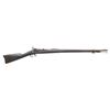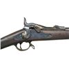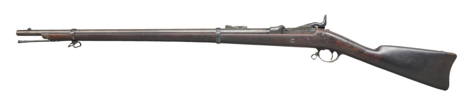 Cal. 45-70. S# 48417. Bbl. shortened to 29 5/8" w/ dovetail mounted barleycorn front sight & tangent ladder rear sight. High arch breech block marked "MODEL / 1873 /" eagle / crossed arrows / "US". Lock marked "US / SPRINGFIELD / 1873". 2 Band walnut stock w/ stacking swivel, sling swivels & musket buttplate. Toeline of stock behind trigger guard has faint circle "P" proof & " 00 / 04" marking. Slotted tipped ramrod. CONDITION: fair bbl. blue fading to brown w/ patina, handling marks & pinprick oxidation. Breech block has faded to brown/black patina. Good blue on lock & hammer. Sanded & refinished wood has moderate handling marks w/ a few cracks. A notable repaired break from behind lock, around wrist to below top lockplate screw. Buttplate has dark pitted appearance. Good plus bore w/ light pitting. (01-20365/MD). ANTIQUE. $350-500.