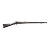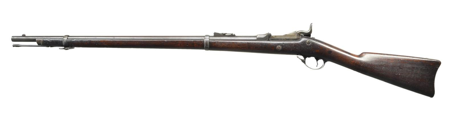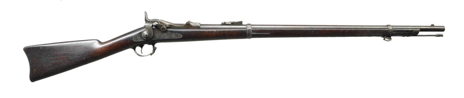 Cal. 45-70. S# 71966 (1877). Bbl. 29 5/8". Barleycorn front sight & 1100 yd. rear sight. Breechblock dated 1873. 2 Band walnut stock w/ stacking swivel, sling swivels, musket buttplate & slotted tipped ramrod. CONDITION: fair blue under brown patina. Faded case colors blending w/ gray/brown patina. Fair intact stock has areas of worn peeling varnish, sm. chips throughout & deep impressions. Triggerguard has good blue w/ peppery oxidation & patina. Top of wrist has 3 holes & outline of previous tang mounted sight base. Breechblock shows slight play when locked into action. Very good bore showing strong rifling & light frosting near muzzle. (01-22288/MD). ANTIQUE. $600-900.