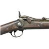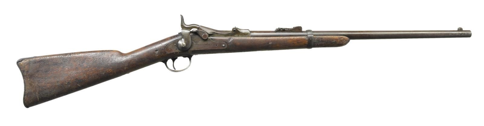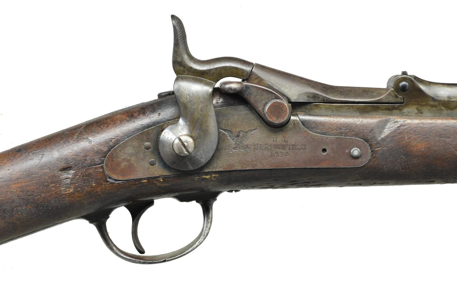 Cal. 45-70. S# 3166. Bbl. 22". Blade front sight w/ 1873 rear sight having 500 yd. graduated base & 1,200 yd. graduated leaf. Model 1873 high arch breech block w/ eagles head, crossed sabers & "US" marking. 1873 Dated Springfield lock w/ 2-click tumbler. Single band fastened short comb walnut stock w/ out having cleaning rod compartment having solid carbine buttplate having saddle ring bar on left side. CONDITION: metal has acquired a pleasing brown patina appearance. Stock has a weathered appearance showing numerous dents & deep gouges w/ cracks & chips in action & lock area. Bore retains largely in tact rifling showing some light pitting. (01-20415/DS). ANTIQUE. $2,000-3,000.