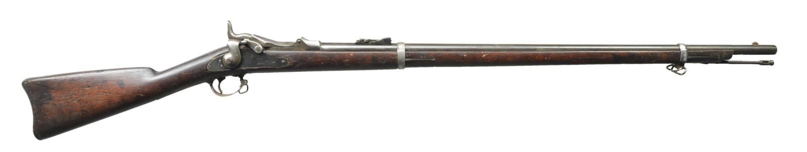 Cal. 45-70. S# 47368. Bbl. 32 5/8". Barleycorn front sight & 1873 tangent rear sight. High arch breech block marked "MODEL / 1873" / eagle / crossed arrows / "US". Springfield 1873 lock. 2 Band walnut stock w/ musket buttplate. Left side of stock by lockplate screws has "ESA" cartouche. Buttplate marked "US" & "106"; possible rack number. Slotted tipped ramrod. CONDITION: good blue fading to brown w/ pitting & oxidation. Receiver has gray/brown patina appearance w/ oxidation & handling marks. Lock has pitting & wear obscuring markings. Polished bright bbl. bands have pitting. Stock has good finish over moderate handling marks & sm. cracks. Good bore w/ lg. section of pitting near muzzle. (01-20358/MD). ANTIQUE. $300-500.