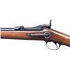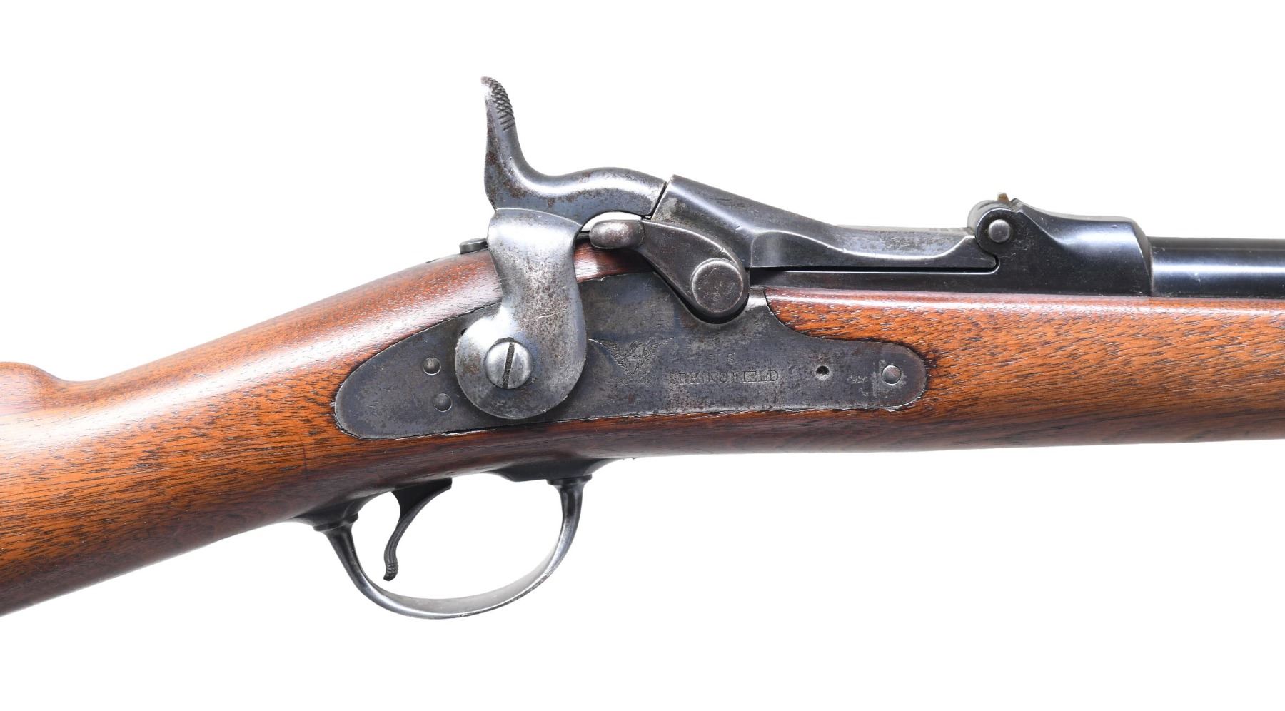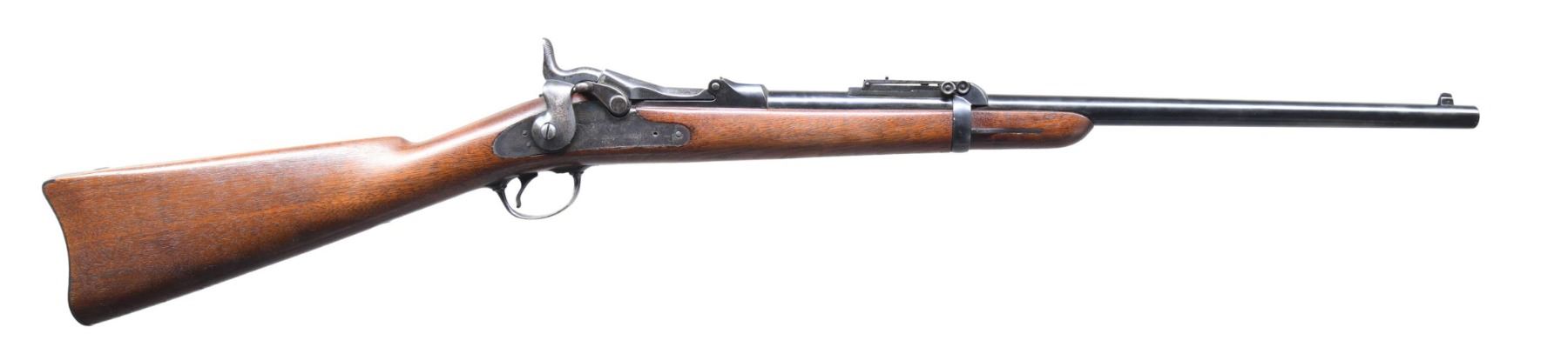 Cal. 45-70. S# 381105. Bbl. 22". Pinned blade front sight w/ Buffington rear sight. 1873 dated low arch breech block. US Springfield marked lock. Band fastened long comb walnut carbine stock w/ saddle ring & bar on left side. CONDITION: metal retains 80% reblued finish. Refinished stock. Sound mechanics. Bore is generally bright w/ sound rifling. PROVENANCE: from the renowned collection of quality sporting arms from Lewis Drake together with inventory of Lewis Drake Associates. (01-26169/DS). ANTIQUE. $1,000-1,500.
