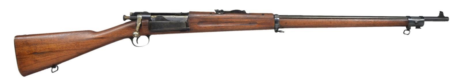Cal. 30-40 Krag. S# 172349. Bbl. 30". Model 1902 rear sight w/ sliding peep. Blade front sight. Matching walnut stock set marked only w/ partly legible script "P" under grip & faint "40". Nickel plated oiler in butt. CONDITION: rifle has been refinished rendering markings obscure & w/ loss of wood in inletted areas. Metal finish has been enhanced w/ light wear, scattered fine pitting. Notable pitting on mag. box. Bore is shiny, but has worn lands. (21-1631/RW). CURIO. $500-800.