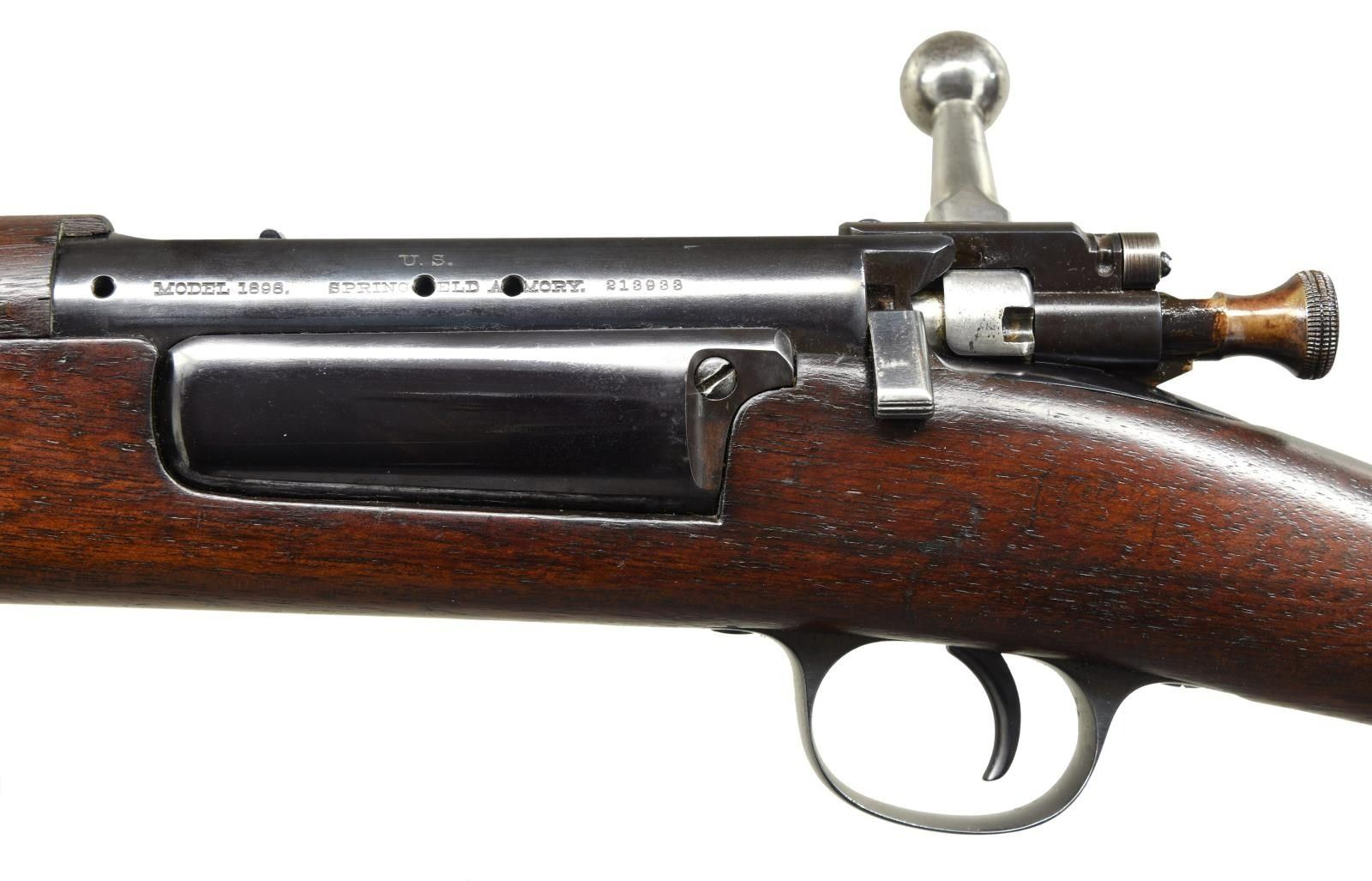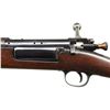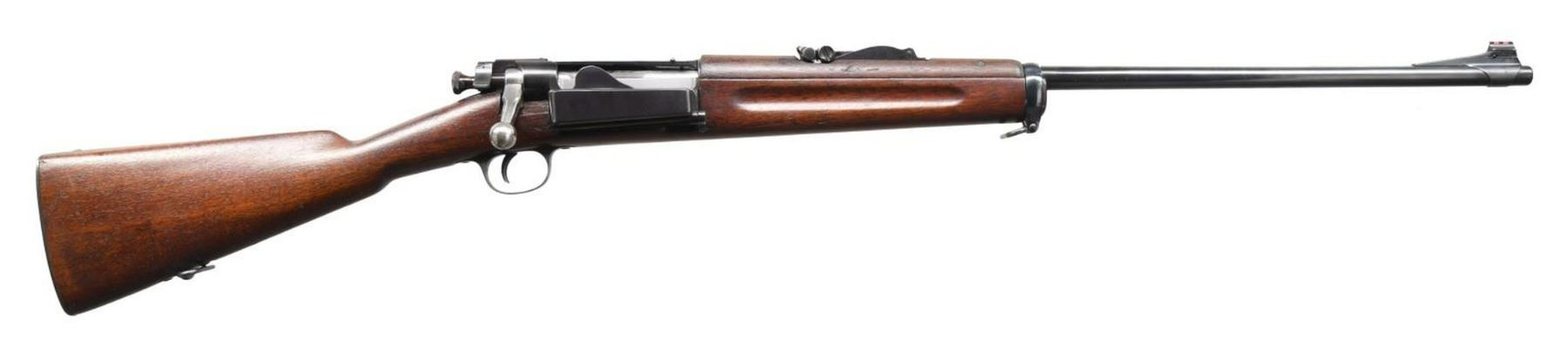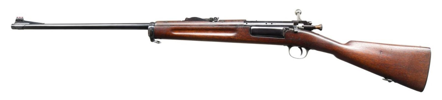 Cal. 30-40 Krag. S# 213933. Bbl. 24 3/4". Modified to sporting configuration from a Model 1898 military rifle. Model 1902 rear sight w/ sliding peep. Sighting notch has been cut deeper & widened. Front sight replaced by Lyman banded ramp sporting type w/ red fiber optic bead. Bbl. has been shortened. Receiver drilled & tapped for side scope mt. Bolt has unmarked low scope safety. Unmarked walnut stock set. Handguard has been cut on left side for scope mt. clearance. Straight smooth trap buttplate. Buttstock has been reshaped in the nose & grip area. CONDITION: stock has been refinished removing markings. Lg. missing chip between mag. & bolt seat. Stock has been cut approx. 3/16" above lower band. Balance of stock and upper band are not present. Metal has been heavily polished except bolt body is polished bright. Wood & metal have light wear & scattered handling marks. Bore has moderate wear w/ appearance of frosting. PROVENANCE: From the Estate of Harry Henry. (23-5098/RW). MODERN. $250-350.