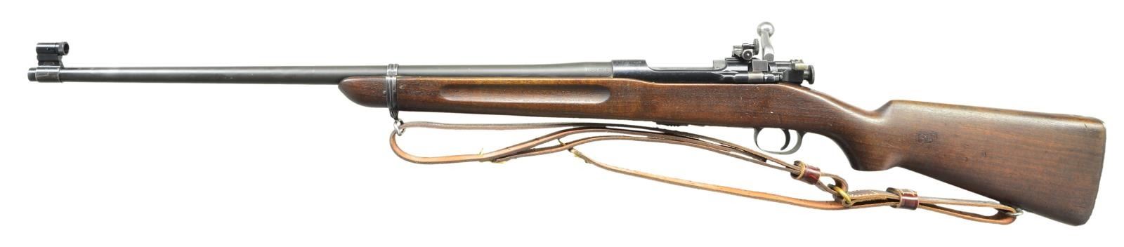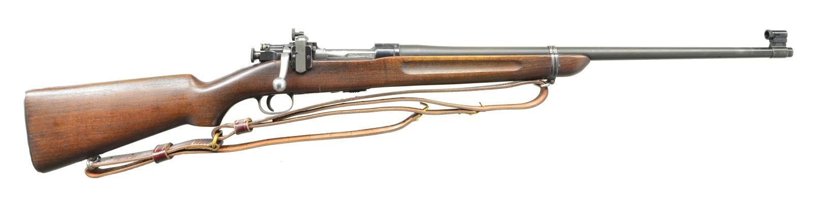 Cal. 22 LR. S# 5387B. Bbl. 24 1/2". Band mounted globe front sight w/ Lyman 48 receiver sight. MI action is converted & remarked to MII style. Bolt is numbered to rifle, bolt handle marked "NS/M2". First type conversion w/out adj. headspace mechanism having knurled cocking knob & shortened bolt throw. Type B finger groove stock w/ deeply checkered steel buttplate. Left side of stock has "SA" marking. Modern sling on original swivels. MAGS: 3 total. 2 Original 5 rd. & 1 replacement 5 rd. CONDITION: bbl. shows 80% lightly faded parkerized finish. Receiver retains 90% polished blue finish. Bottom metal finish is flaking to brown showing handling marks. Original stock finish shows scattered scratches & marks. Bore retains strong rifling. PROVENANCE: From the estate collection of Charles P. Obremski. (22-1278/DS). CURIO. $800-1,200.