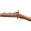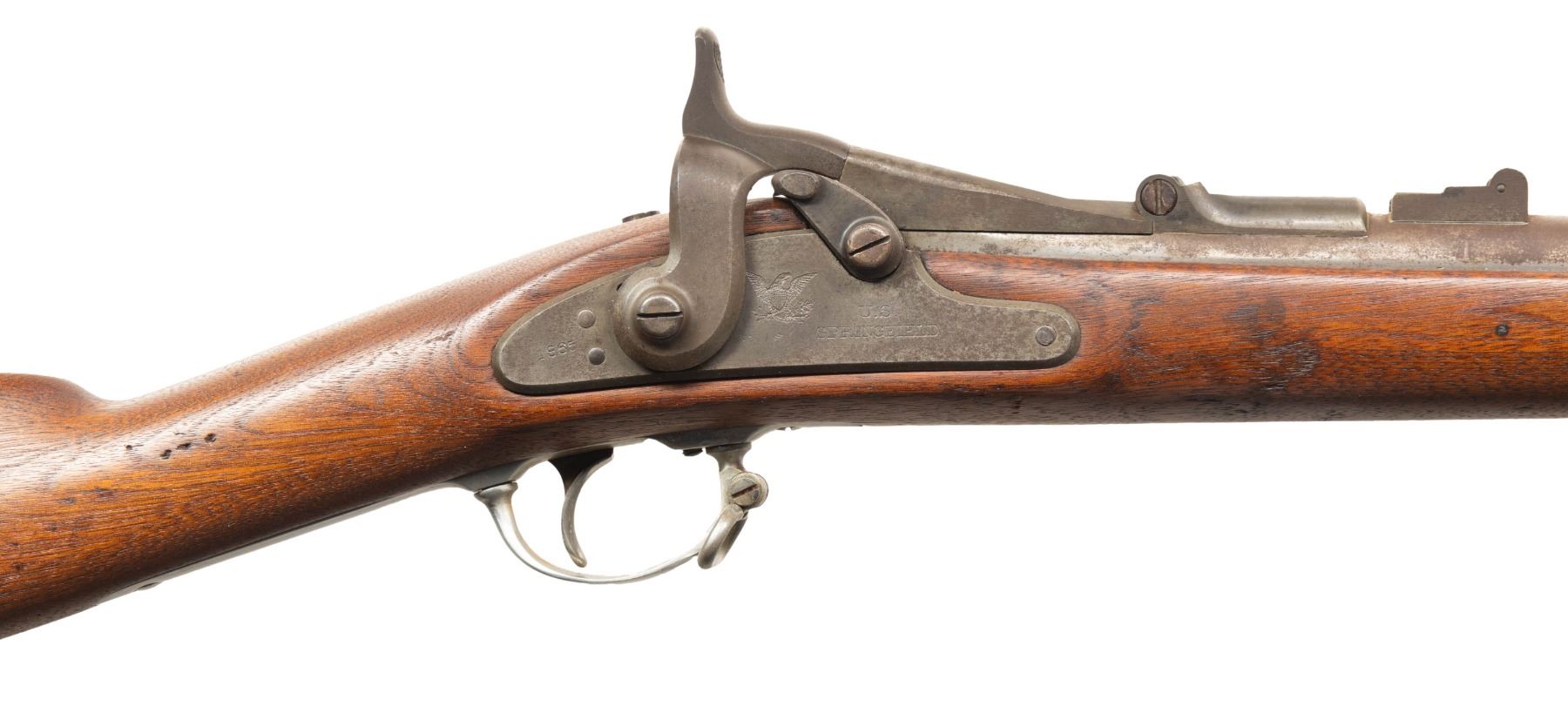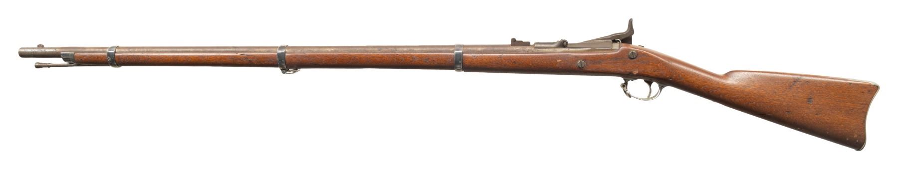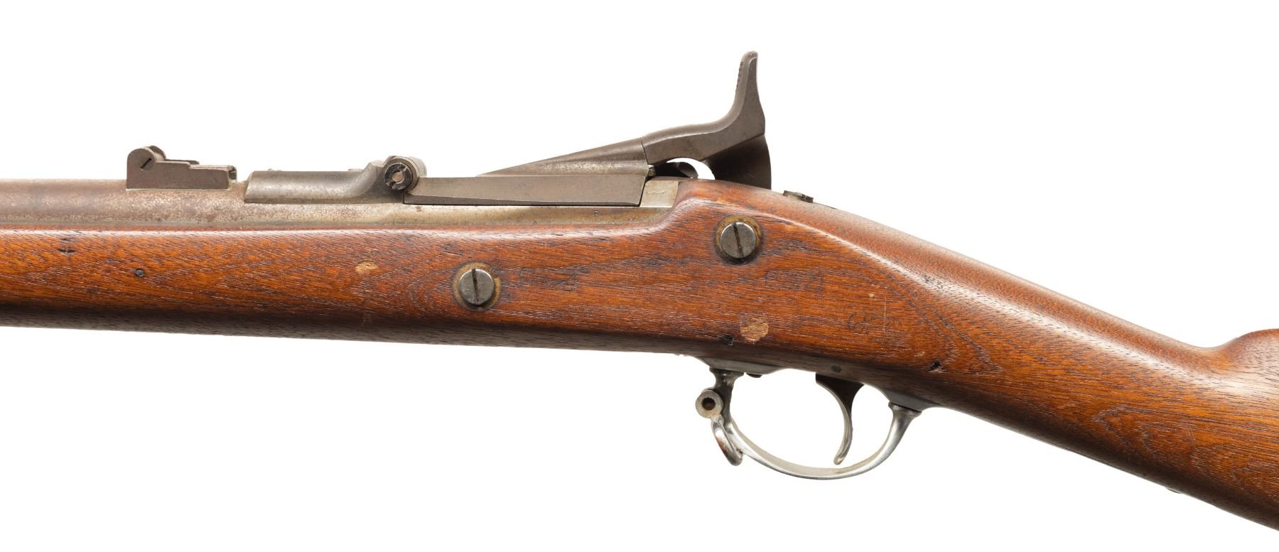 Cal. 50-70. NSN. Bbl. 36 5/8". Blade front sight. Dual-leaf rear sight. Springfield Armory 2nd Model Allin Trapdoor rifle converted from an earlier musket. 1866 dated breechblock. 1865 dated Springfield lock. Breechblock & lock assemblies have case colored finish. Balance of other parts have bright finish. Walnut stock set with bottom mounted sling swivels. Two faint inspector's cartouches on left side. Replacement ramrod present. CONDITION: sanded stock shows a 1 1/2" crack on left side between bands, some chips in ramrod channel, a few gouges, scattered dings & handling marks. Lock & breechblock assembles are a dull gray patian with some light pitting & overall. oxidation. Bands, trigger guard & buttplate cleaned to bright with scattered light oxidation & some scratches. Bbl. is mostly a gray patina with overall oxidation, some scattered light pitting & some areas being dull gray. Action functions properly when hand cycled. Bore is paritally bright with scattered pitting & oxidation but strong rifling. (01-28664/MJC). ANTIQUE. $500-800.