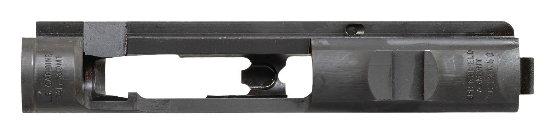 S# SC12650. This receiver is marked at the heel "SPRINGFIELD / ARMORY / serial number". Marked on the left rear "GENESEO. IL". Receiver ring is marked "U.S. / CARBINE / CAL. .30M1". Receiver appears to be investment cast and has not been assembled into a rifle. Receiver contains no additional parts. CONDITION: receiver retains 98% of its original black matte finish with very light hi-point wear. (25-3039/RW). MODERN. $100-200.