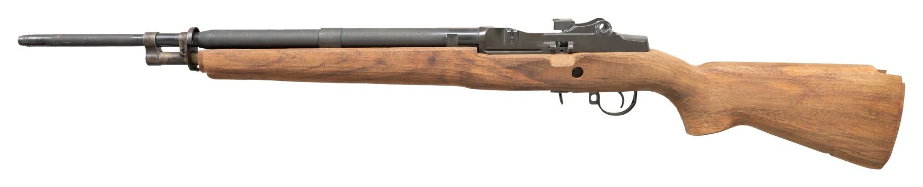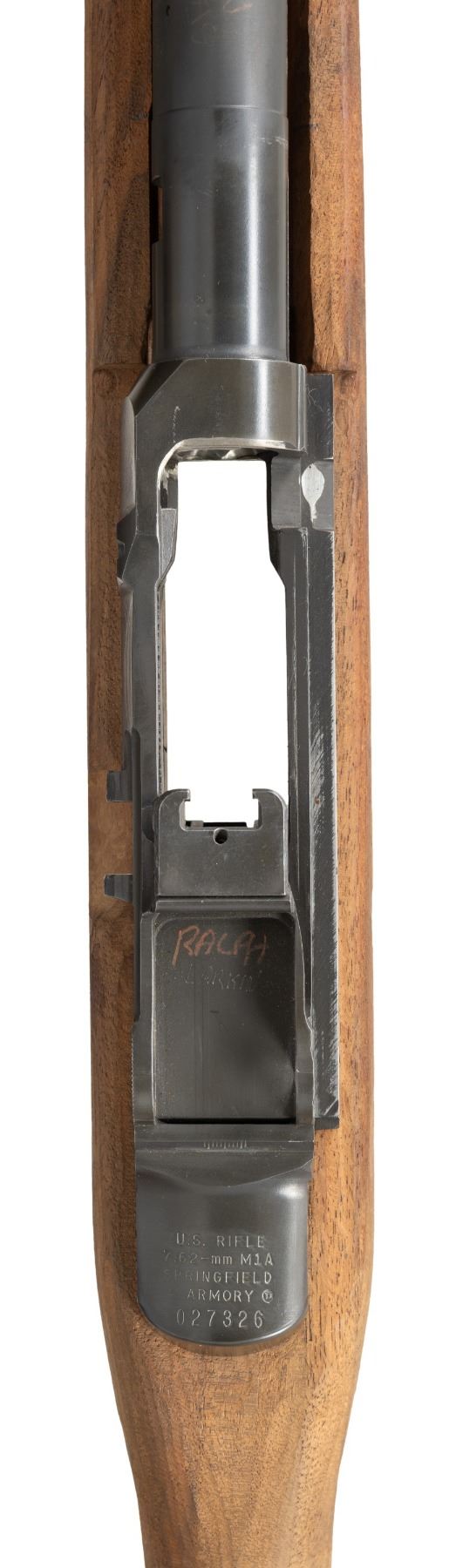 Cal. 7.62mm. S# 027326. Bbl. 22". Springfield Armory action currently sporting a heavy barrel marked "SGW-934847-6-84-4150-1x1 / 11-85" as well as 2 circles w/ "NM" stamped in the center. Trigger group & trigger guard also included in an unfnished, hardwood shoulder stock. CONDITION: unfinished in all aspects. The letters "Ralph Larkin" are written on the inside of the stock in felt pen & scratched on the receiver in the area that will be obstructed w/ the rear sight assembly when completed. Bore is bright w/ visible rifling". (25-3114/JZ). MODERN. $350-500.