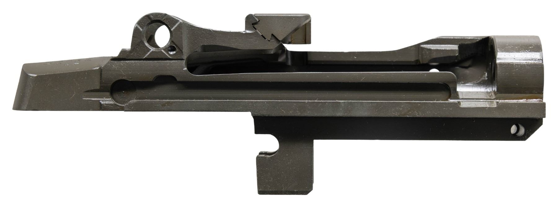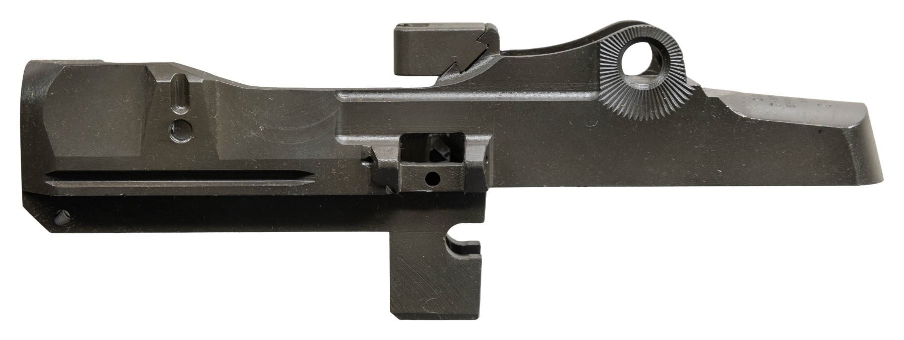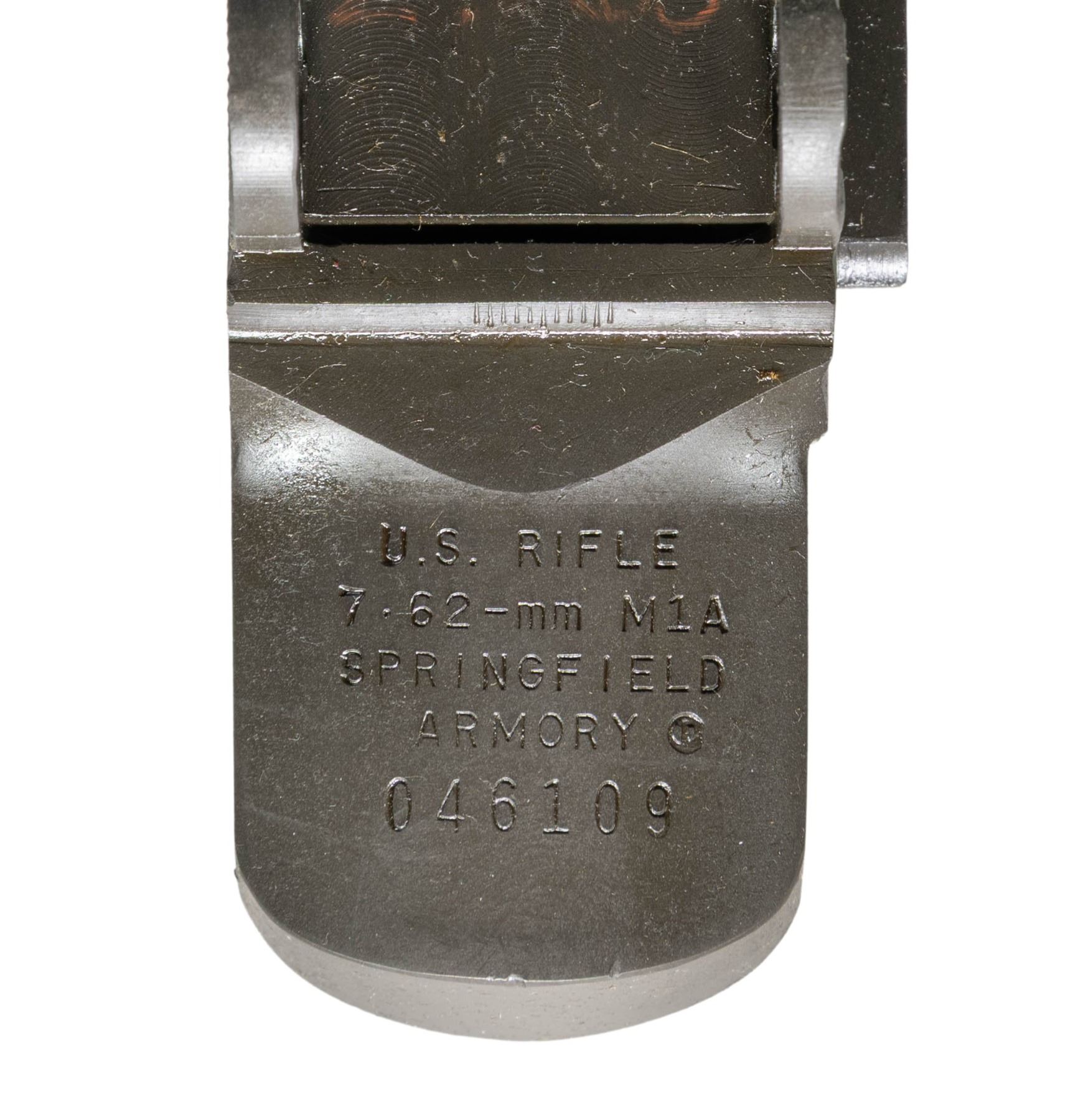 S# 046109. Receiver manufactured in the late 1980s is marked at heel "U.S. RIFLE / 7.62-mm M1A / SPRINGFIELD / ARMORY / serial number". Receiver has inventory number in red at rear sight base. Receiver fitted w/ clip guide, no other parts are present. CONDITION: unfitted receiver appears near new. (25-2943/RW). MODERN. $300-500.