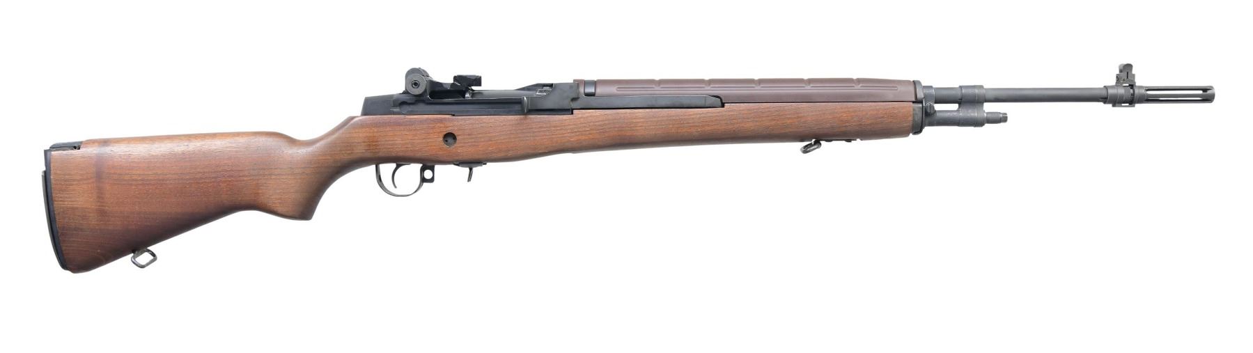 Cal. 308 Win. S# 205332. Bbl. 22", national match with flash hider. GI-style blade front sight with protective ears. NM adjustable aperture rear sight without hood. Commercial Springfield Armory Inc. M1A that is likely a "loaded" model. Parkerized finish. Walnut stock set with buttplate trap and bottom-mounted sling swivels. Green plastic handguard. Left side of stock has civilian-applied ordnance wheel cartouche. MAGS: none present. CONDITION: stock set shows some flaking finish at toe and some scattered handling marks. Metal retains 95% original parkerized finish with some edge wear, most notably on gas cyl. assembly and white sticker remnants on stripper clip guide. Action functions properly when hand-cycled. Bright, near excellent bore. (24-5413/MJC). MODERN. $800-1,200.