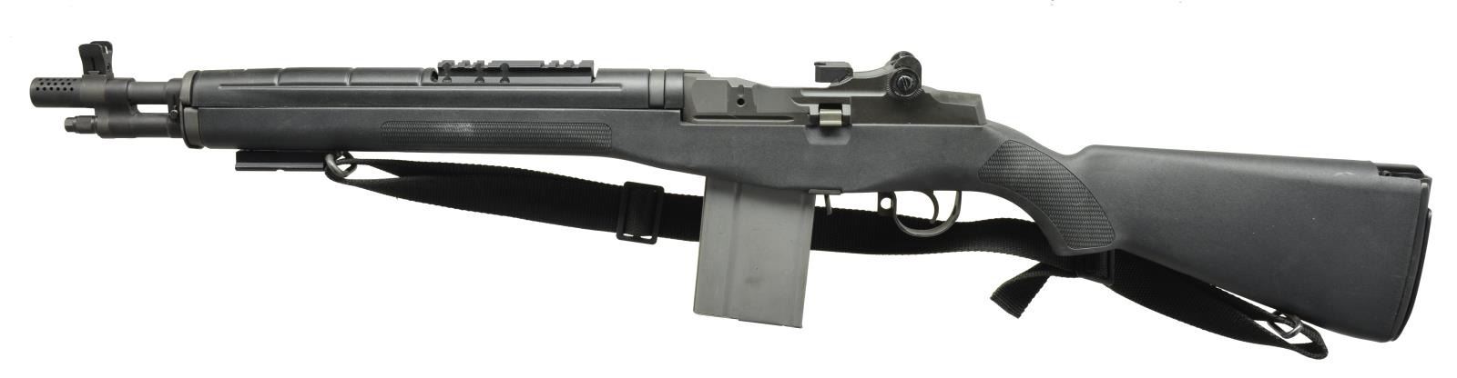 STOCK AND SCOUT RAIL. Cal. 308 Win. S# 310410. Bbl. 17 1/2" over muzzle brake. The SOCOM 16 is a shortened version of the legendary M1A battle rifle. Lighter in weight, more portable, & easier to field, it provides the ballistic superiority of the proven 7.62 NATO cartridge in a smaller, more manageable package. Black synthetic stock. Dark parkerized finish on all exposed metal surfaces. Trijicon front sight consisting of a protected blade & rear peep sight adj. for elevation & windage w/ 21" radius. Middle length of bbl., there is a 4" rail section which has become a popular mounting spot for scout type optics. At 6 o’clock on stock 2 1/2" rail section suitable for bipod or accessory mounting in front of front sling swivel, corresponding rear sling swivel at 6 o’clock on shoulder stock. Safety runs through center of trigger guard in traditional fashion. Right side reciprocating charging handle. Black nylon sling. MAGS: 2-20 rd. & 1-10 rd. UNATTACHED ACCESSORIES: factory box, Springfield trigger lock. CONDITION: finish coverage is complete & consistent w/ very little noticeable wear on areas other than those of mechanical intervention. Scope mount illustrates prior mountings. Stock free of any noticeable significant blemishing. Shiny bore w/ well pronounced rifling. Fire control mechanism appears to function correctly when cycled by hand. (21-733/JZ). MODERN. $800-1,200.