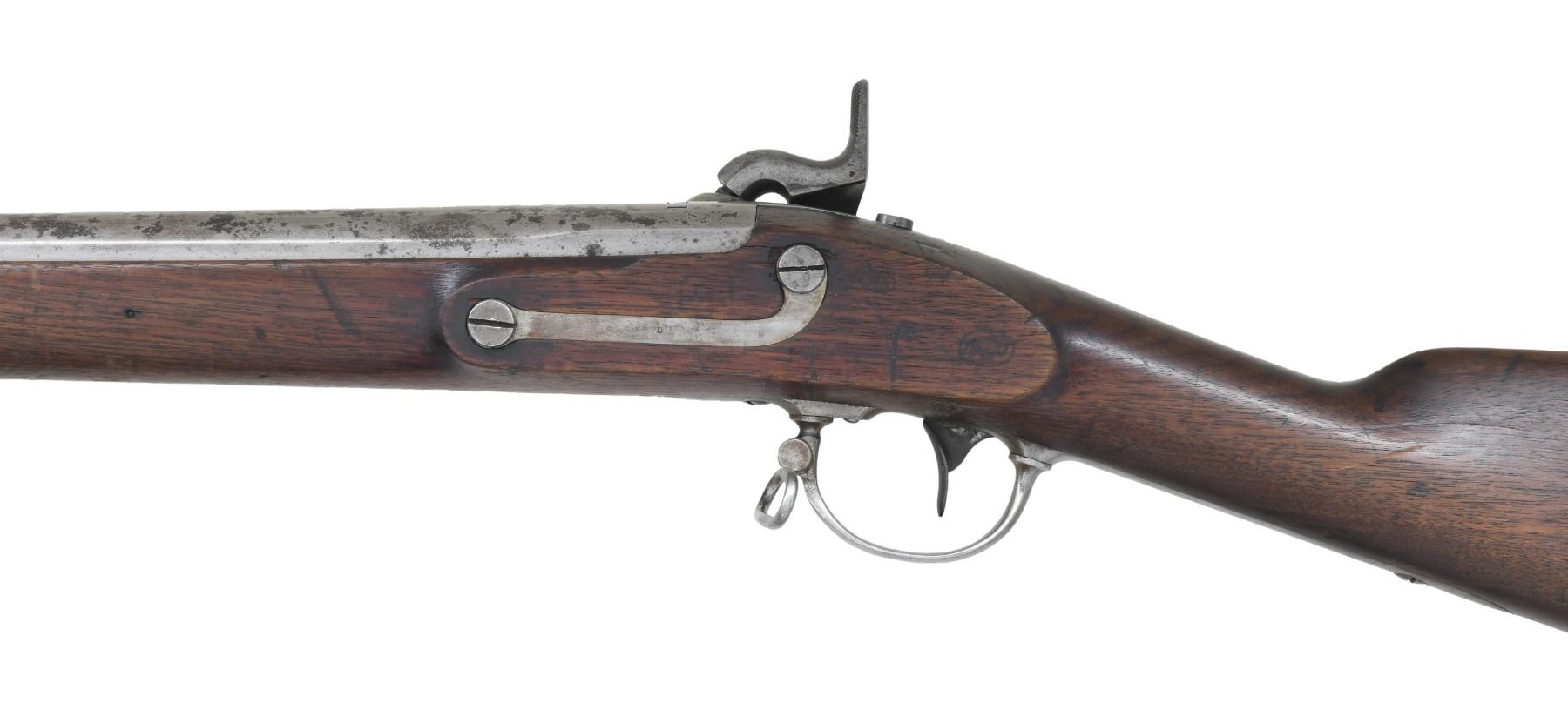 Cal. 69. NSN. Bbl. 42" rnd. with smoothbore and "1845" date on top tang. Breech end of bbl. has "V/P/ (EAGLE HEAD)" proofs with apparent rack marking "178". "1845" dated Springfield lock with American eagle over "US" forward of the hammer. 3-band fastened walnut stock with iron fittings. Left stock ear has partially visible cartouche. Trumpet tipped iron ramrod. Approx. 172,000 mfg. at Springfield Armory 1844-1855. CONDITION: bright finished metal shows large spots of dark tarnish. Stock has worn finish showing numerous scratches, marks, and small dents. Right side of stock has a small crack behind the lockplate. Sound lock and trigger. Smoothbore has a frosted appearance showing scattered pitting. (01-27379/DS). ANTIQUE. $500-900.