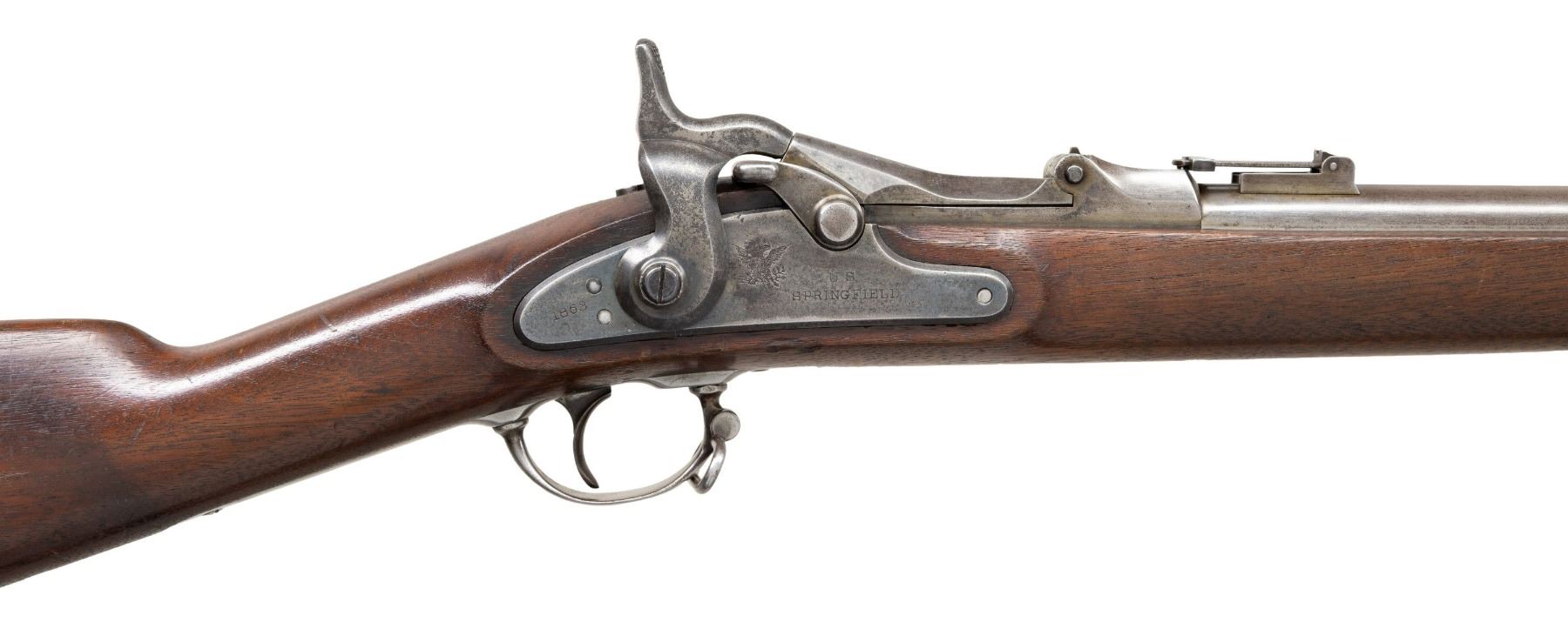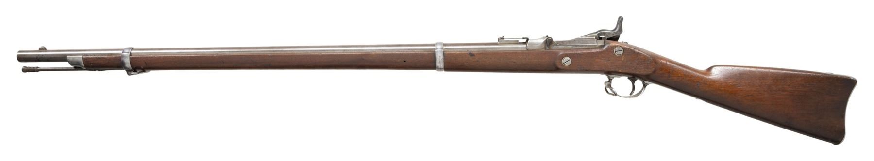 Cal. 50. NSN. Standard configuration, one of about 11,000 made 1870-1873, 32.5" barrel with adjustable rear sight, breech marked "MODEL / 1870 / eaglehead & crossed arrows / US". Surplus Civil War 1863 dated Springfield lock, inspection marks in stock rear of trigger guard. CONDITION: very good to fine overall, complete and original, cleaned metal, good markings, stock is sound with good inspection marks, mechanics fine, good rifled bore. PROVENANCE: Estate Collection of John "Jack" Dhooghe. (01-28243/JS). ANTIQUE. $800-1,200.