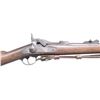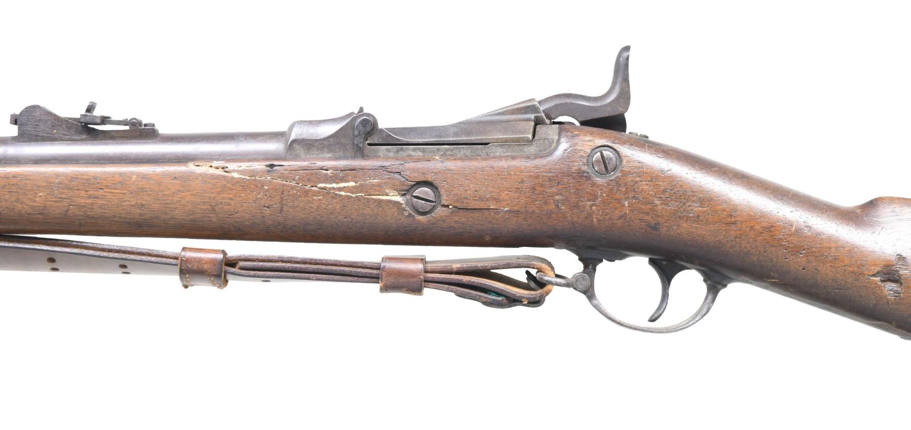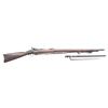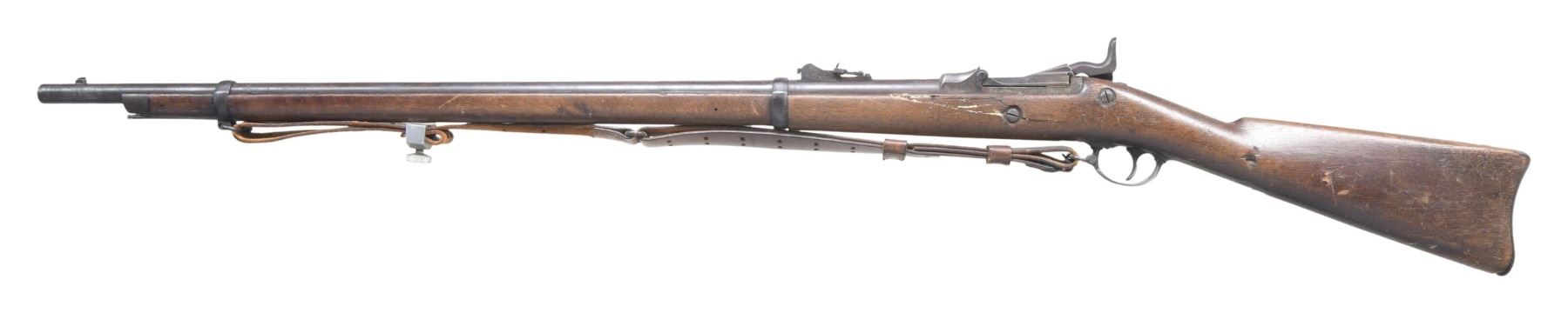 Cal. 45-70. S# 220118. Bbl. 32 5/8". Barley corn front sight with Model 1873 graduated leaf rear sight. Breechblock is dated "1873". Springfield marked lock. 2-band walnut stock with iron fittings. Leather military sling. UNATTACHED ACCESSORIES: U.S. marked triangular bayonet with metal scabbard. CONDITION: metal has faded to mottled gray/brown with surface corrosion and areas of light pitting. Stock shows heavy wear with dents and marks having a large chip below the lock with smaller chips around the butt. Functioning lock and action. Bore has a frosted appearance and retains intact rifling. Bayonet and scabbard have faded brown appearance with scattered spots of light pitting. (01-27149/DS). ANTIQUE. $400-600.