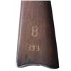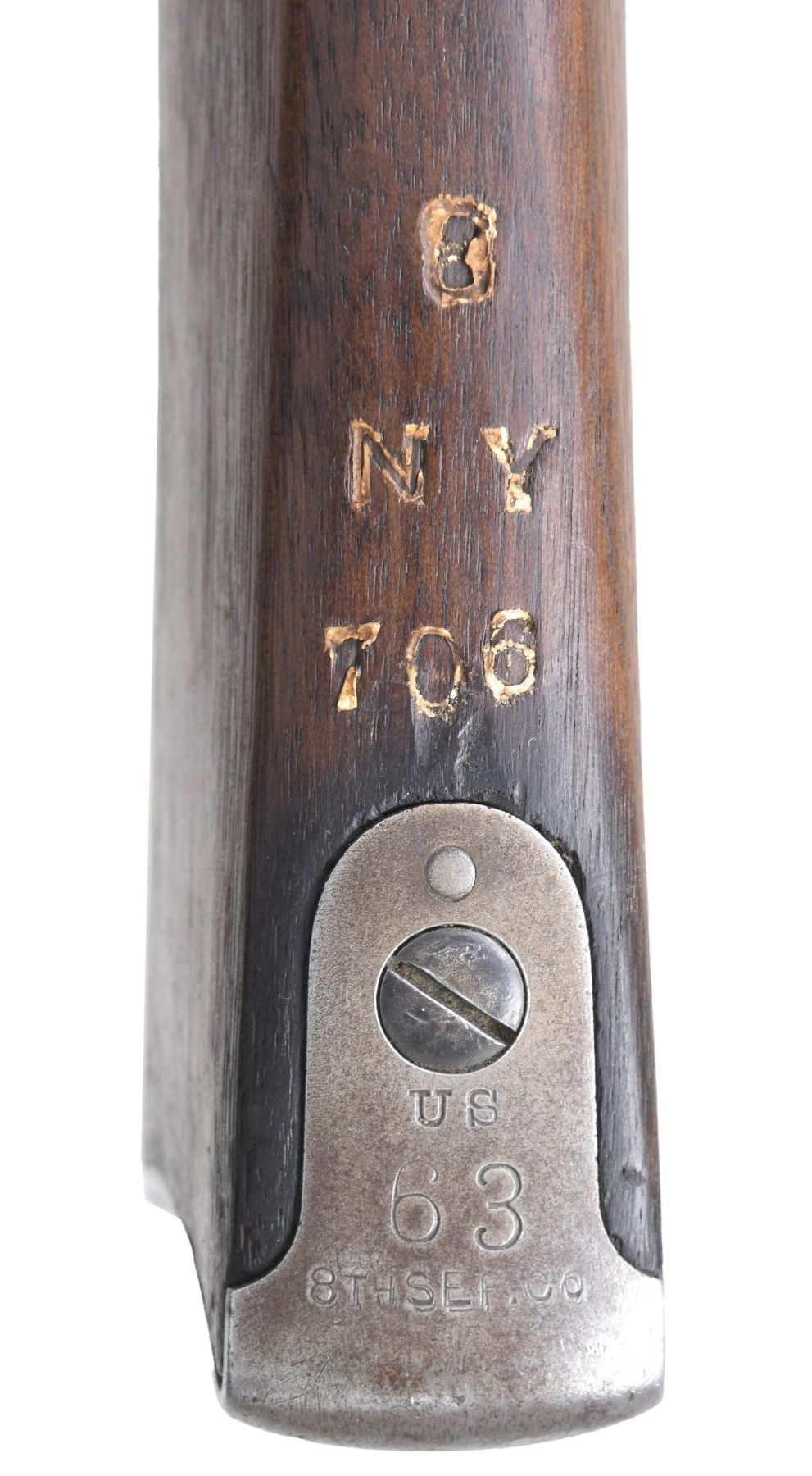 BAYONET TRAPDOOR RIFLE. Cal. 45-70. S# 380950. Bbl. 32 5/8" fitted w/ a rigid front sight cover. Experimental sliding round ramrod-bayonet differs from the later 1888 production model w/ its short side ears that project outward & single square shoulders at each groove. Total of 1,000 produced for trial use. Very scarce, survival rate is quite low. Buffington rear sight w/o letter stamp. 1884 dated low arch breech block. U.S. marked Springfield lock. Band fastened walnut stock w/ trapdoor buttplate. Left ear of stock has "ESA" cartouche. Right side of stock is stamped w/ a large "8" over smaller "535". Top of comb is stamped "8/NY/706". Peak of buttplate is stamped "US/63/8TH SEP CO". Known serial number range for the 1884 experimental rifle is the 320,000 range. CONDITION: bbl. has gray coloration from touch-up finish showing scattered light pitting. Action & iron fittings retain 50% fading blue. Stock has age darkened appearance showing dents & marks. Bore is generally bright w/ strong rifling. (01-26192/DS). ANTIQUE. $1,800-2,400.