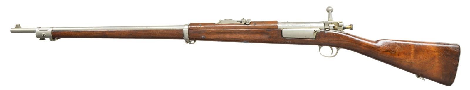 Cal. 30-40. S# 79983. Bbl. 30". Fixed blade front & later M1902 rifle rear sights w/ proper handguard & full length stock. CONDITION: metal has been nickel plated for “parade use” & stock set has a thick added coat of varnish leaving no visible markings. Bore has visible nearly strong rifling but is dull w/ pitting. (01-22263/CW). ANTIQUE. $400-600.