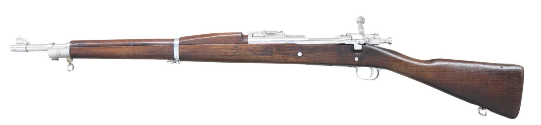 Cal. 30-06. S# 1386708. Bbl. 24". Marked behind front sight "HS / flaming bomb / 7 44". Rifle which bears a Raritan Arsenal rebuild mark has had its metal parts totally chrome-plated except the follower & fine checkered milled buttplate. Model 1903A3 walnut stock & Model 1903A3 handguard set w/ visible markings. The standard 1903 sights are fully functional, except the sight slide screw is an incorrect replacement. UNATTACHED ACCESSORIES: nickel-plated oiler in butt. CONDITION: stock set w/ its arsenal rework finish has wear w/ numerous handling marks. Chrome-plated parts have wear & small scratches throughout while retaining its shiny appearance. Good shiny bore w/ lightly worn lands. (25-2864/RW). CURIO. $400-600.