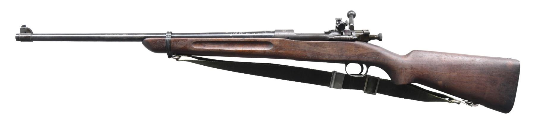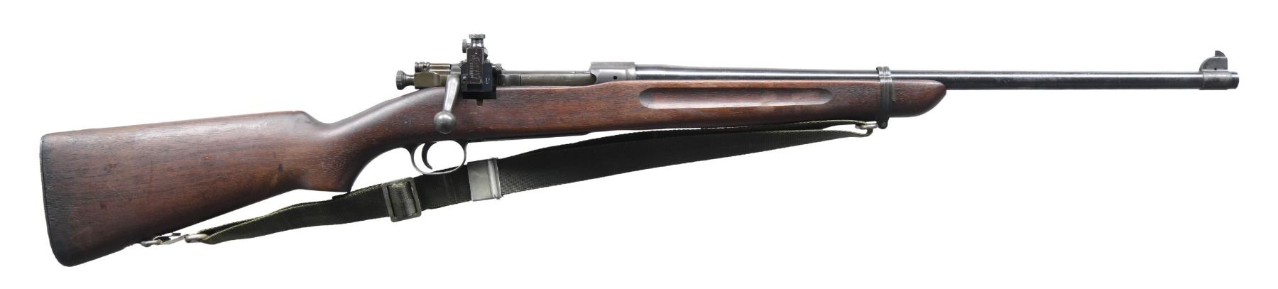 MILITARY RIFLE. Cal. 30-06. S# 46335. Bbl. 21 5/8". Rifle has been assembled on an early production(1911) receiver. The S# has an added vertical mark at each end, resembling "1". The bbl. has been shortened & a one-piece 1903A3 front sight base & blade have been installed. The original rear sight is not present, however, a late production Lyman #48 receiver sight has been mounted on the bridge. This sight has a short slide, graduated to 60 points & is fitted w/ target knobs. The sight S#s are non-matching. Rifle is fitted w/ a Remington marked bolt. The mag. cutoff has been altered to clear the sight windage knob. The pistol grip walnut stock w/ grasping grooves is from a Springfield 22 Training Rifle & does not have the recess for the mag. cutoff & is mortised on the right side for the original style Lyman Model 48 sight, leaving a gap in the wood. The bbl. band has a notably large clearance over the bbl., but fits the stock correctly. Coarse checkered trap buttplate. Green nylon Vietnam era military sling. UNATTACHED ACCESSORIES: nickel plated oiler in butt. CONDITION: the stock has a very good original arsenal finish w/ light wear, scratches & a number of scattered handling marks. Metal has a mix of amatuer gunsmith blue w/ thinning wear & spots of light oxidation. Bbl. has notable loss of finish prior to chamber area. Bbl. has a very good bright & shiny bore. (24-6926/RW). MODERN. $400-600.