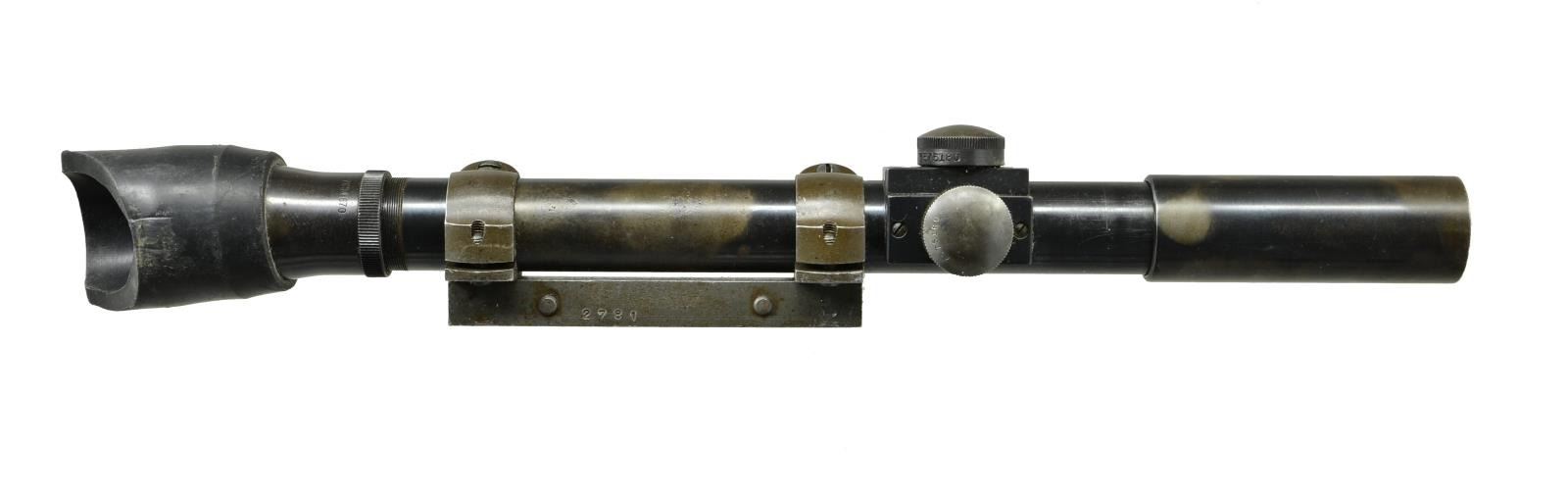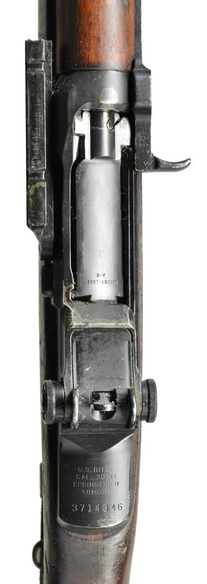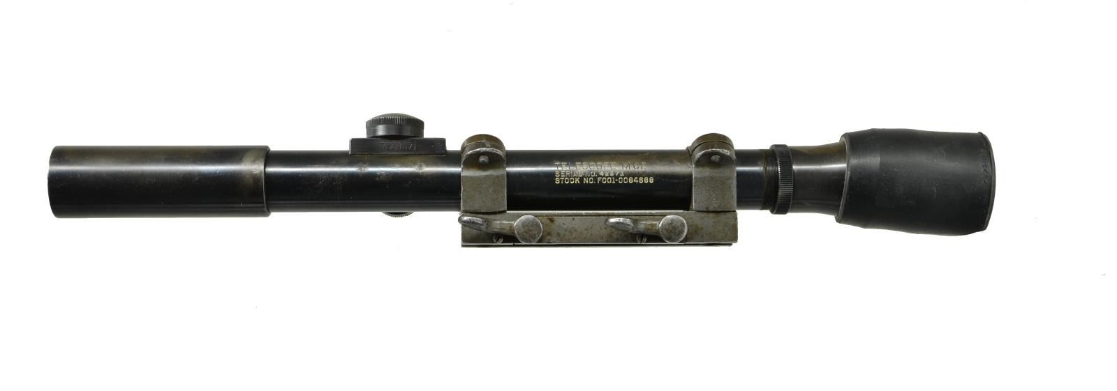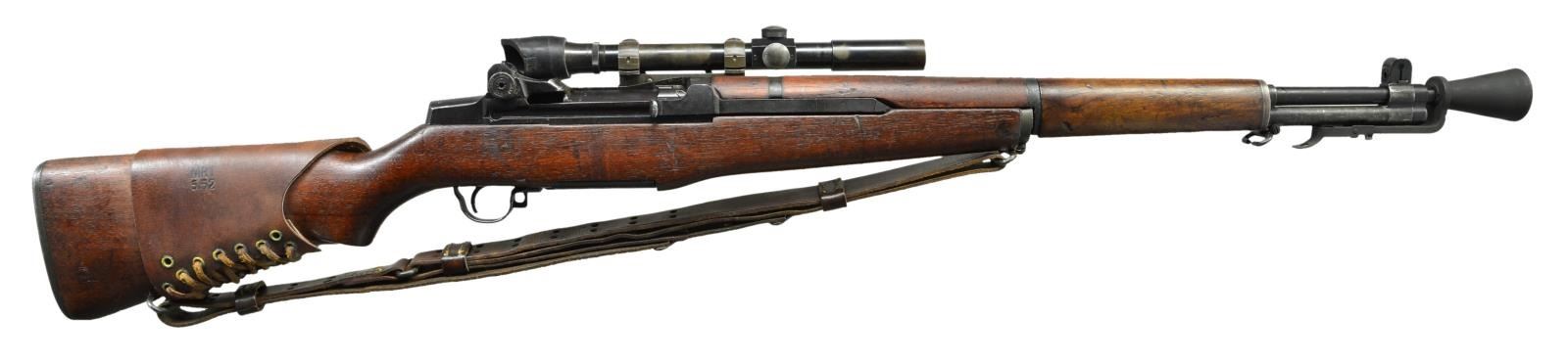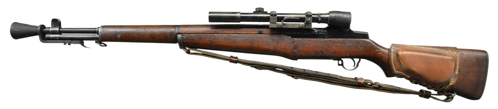 Cal. 30-06. S# 3714346. The 24" bbl. is dated "7/51" & fitted w/ T37 flash hider. Springfield action fitted w/ Griffin & Howe type sidemount on left. Walnut stock w/ post 1953 eagle inspection cartouche fitted w/ leather cheekrest marked "MRT 5/52". Rifle fitted w/ M82 telescopic sight, S# 52371 w/ stock number in G&H marked slide w/ original S# removed & restamped "2781" on right. Scope retains rubber eye shield. A leather sling is installed w/ hooks stamped "B". CONDITION: good. Bbl. & action w/ dark gray almost black finish. Stocks have numerous marks & bumps. Top slide & rings are re-parkerized. Bore is fine, shiny. Throat & muzzle ga. is 3. Mechanically good. Scope is good to very good w/ considerable loss to finish on tube. Optically clear. Flash hider is very fine. PROVENANCE: From the estate collection of Charles P. Obremski. (22-1270/MGM). CURIO. $2,500-4,000.