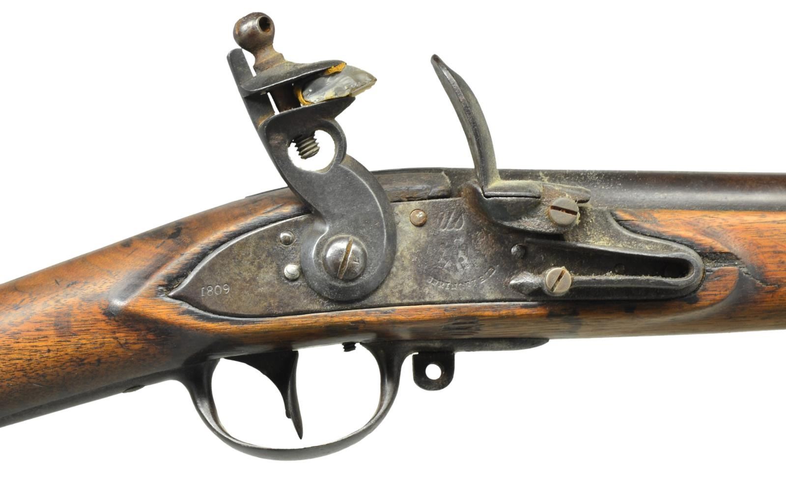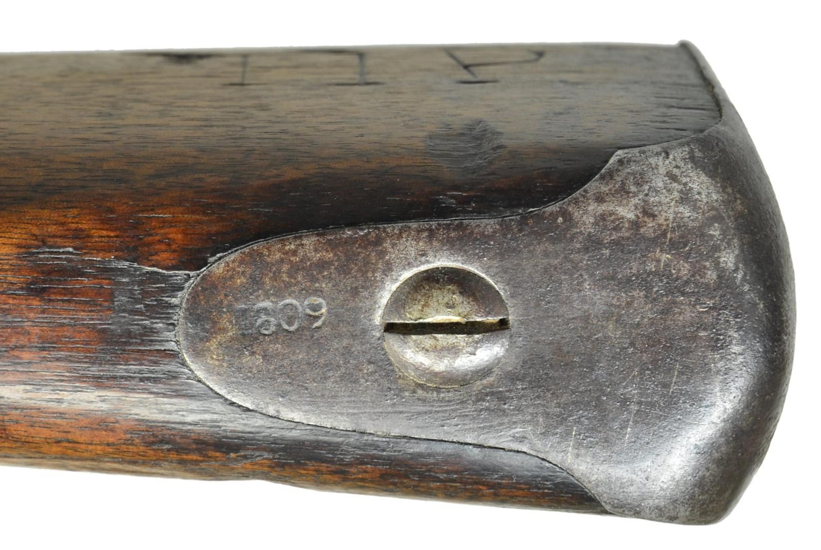 1809. Cal. 69. NSN. Bbl. 44 7/8". Standard configuration. Bbl. attached to stock w/ 3 spring retained bands. Rear portion is stamped w/ “P”, eagle head & “V” proofs along w/ an additional “V” & the “S” is visible from “US”. Bbl. appears to be in original flint configuration. 1795 style type II lock has removable rounded pan, straight top to cock, straight base to frizzen & spear finial on feather spring. Lock is stamped w/ “US”, eagle & “SPRINGFIELD” in front of cock & has date “1809” on tail. Walnut stock has deep fluted comb Triggerguard has rounded finials. Buttplate is stamped “1809” on tang. The initials “HP” are carved on right side of butt. CONDITION: bbl. has a mix of brown & dark heavy patina w/ some silver highlights. Lock is also heavy brown patina. Markings are quite clear. Feather spring & frizzen spring screws are replacements. Cock appears to be original. Stock w/ old refinish has some hand worn patina at grip & is covered w/ a lg. number of minor nocks & dings. There are no major losses of wood except for sm. piece missing at crack in front of lock plate. Bbl. channel is good w/ minor losses & a few cracks. Pitted bore. Lock will not hold at half cock, but is ok at full cock. (01-20134/MGM). ANTIQUE. $1,250-2,000.
