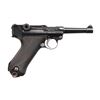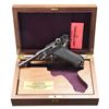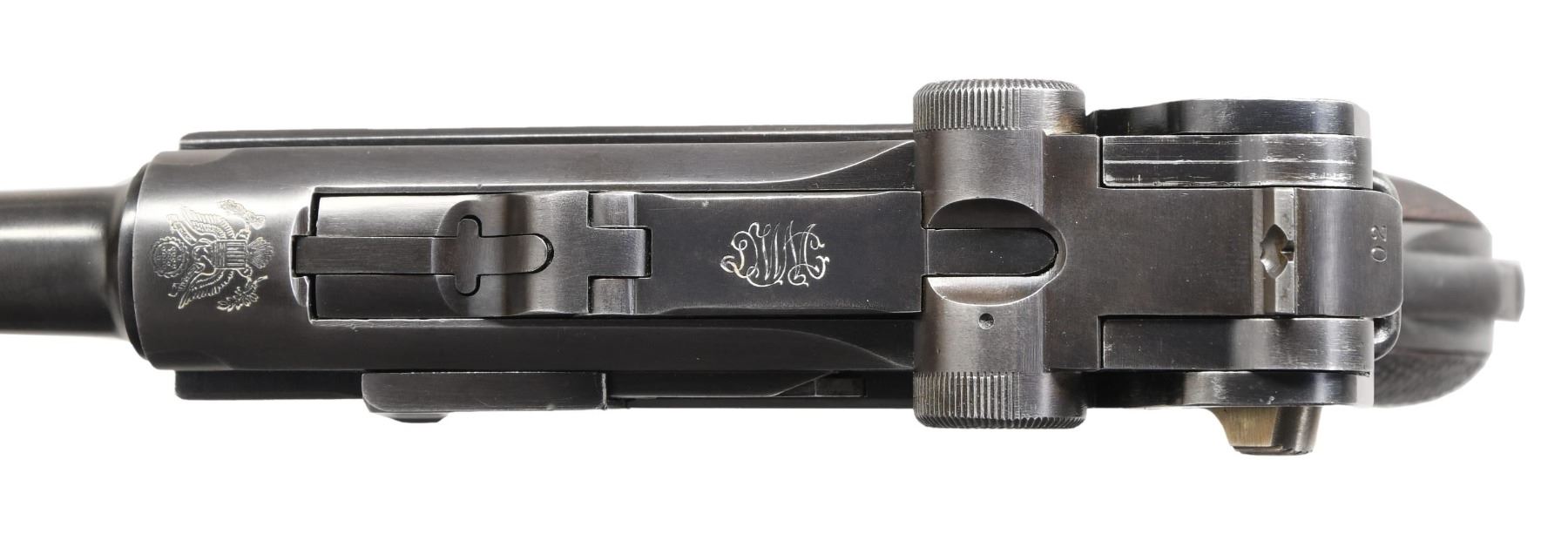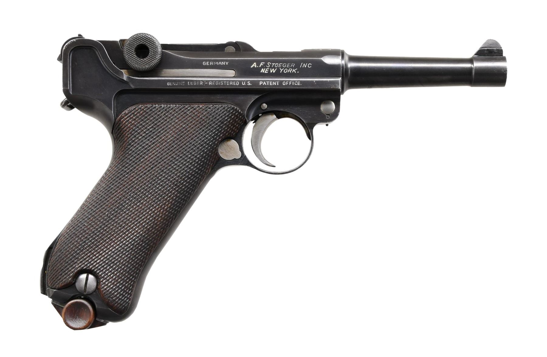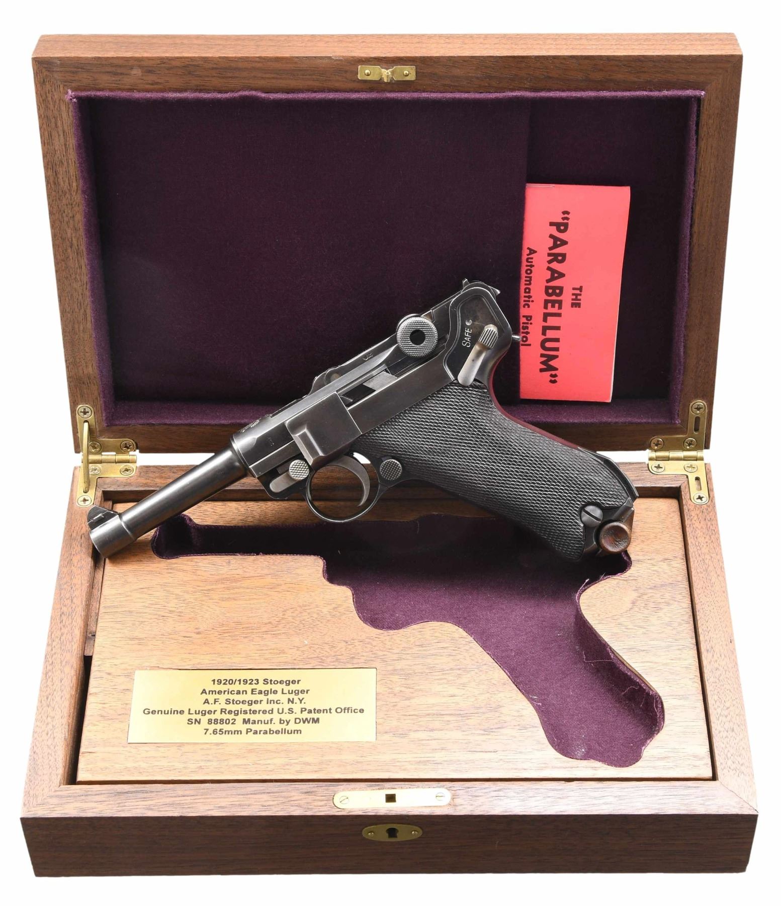 LUGER SEMI-AUTOMATIC PISTOL WITH CASE. Cal. 7.65x21mm Parabellum. S# 88802. Bbl. 3 13/16". Model 1923 Commercial Luger mfg. by DWM for commercial sales. The bbl. extension is marked with a spurious Great Seal of the United States over the chamber, with a Crown/N commercial nitro proof stamped on the left. Right side of bbl. extension and frame exhibit spurious A.F. Stoeger markings, with "A.F. STOEGER INC/ NEW YORK." in particular, appearing to have been hand engraved. Toggle is marked with the intertwined "DWM" monogram. Frame is marked "SAFE", with "LOADED" marked on the left side of the extractor. Major metal components exhibit a reapplied blue finish, with the takedown lever, trigger, safety lever, and ejector exhibiting a reheated straw finish. Frame is mounted with 2-piece checkered wood grips, which have been revarnished. All serialized parts have been renumbered to match. MAGS: 1 8-rd. UNATTACHED ACCESSORIES: custom wood display box containing a reproduction manual and an informational plaque. CONDITION: excellent, as refinished, with metal components retaining bountiful amounts of their reapplied finishes overall. Dark pitted bore, retaining poor rifling throughout. Grips show smoothing and some scattered marks from handling and storage, but otherwise remain sturdy and serviceable. Left grip panel exhibits a small chip to the right of the safety lever. Wood display case is excellent overall. PROVENANCE: From the lifelong Collection of Jim Williams. (24-2615/MLW). MODERN. $1,200-2,000.