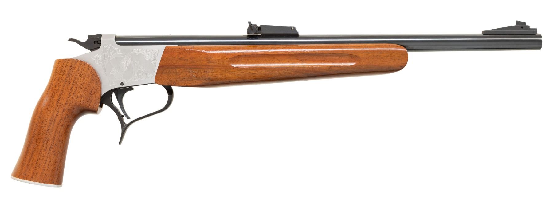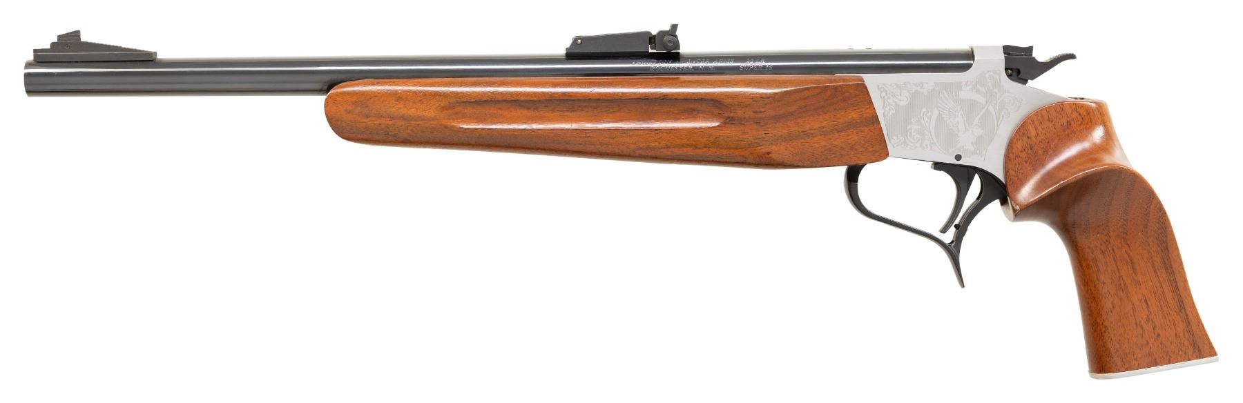 Cal. 22 LR. S# TCA1050. Fitted with blued T/C Contender (Rochester marked) Super 16 barrel having screw attached adjustable sights plus drilled and tapped for a scope base. Made in 2024 by SSK Firearms for TC Collectors' Association using the SSK-50 platform which is 100% crossover compatible with Thompson Center Contender products including the newer G2. Frame is stainless steel with black nitride finished trigger guard; all other small parts are blued. Engraved eagles on each side of its easy open frame were created from the pattern of the original T/C Eagle Contenders (right side eagle, left side puma) of which only 45 were made (documented) in the first year (1967) of the Contender. Serial numbering of the Contender started at 1001 in 1967 and most of the eagles seem to be randomly numbered below 2000. This special edition was offered as frames only to TCA members for $495; 105 units produced. Groves Herrick was a long time member and active participant of the Thompson Center Association. Long smooth, gloss finished walnut forend with finger groove on each side and attached by a single screw. Grip is the silhouette style having integral thumb rest for RH use plus pewter grip cap with raised image of a puma. UNATTACHED ACCESSORIES: TacStar black nylon carry case in near excellent condition. CONDITION: some very light handling marks on the stock set with the balance near excellent including bore. PROVENANCE: Estate of Groves Herrick. (25-5745/NW). MODERN. $450-600.
