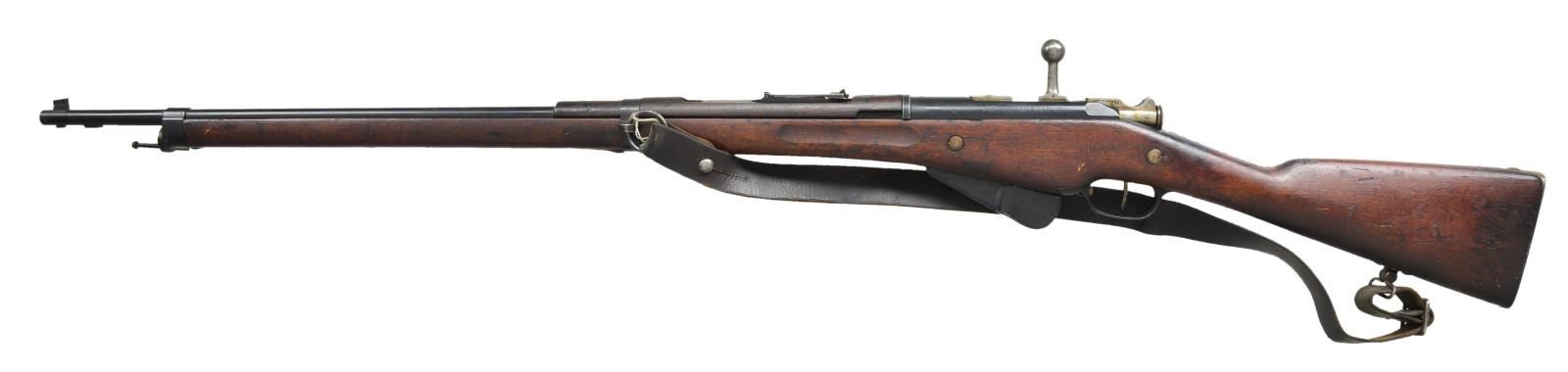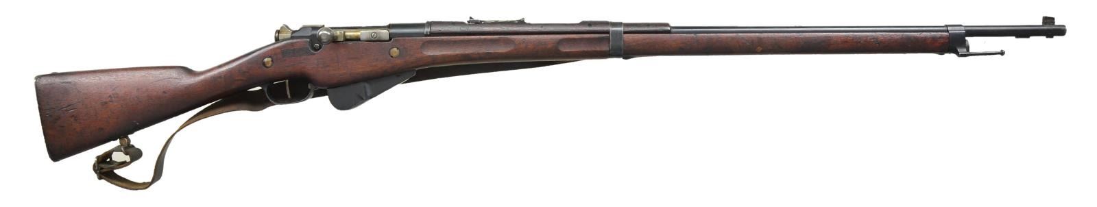 Cal. 8mm Lebel. S# H90566. Bbl. 31". All matching numbers as arsenal refurbished. Updated to M16 five shot configuration. Side rail marked w/ St Etienne. & M1907-15 markings. Top of receiver marked "N" denoting update to N balle round. Bbl. has no date & circled "MF" marking. Ladder rear sight graduated to 2400m. Wide post front sight. Hardwood stock set. Handguard has clearance cut for serial number visibility. Left side of stock & bottom of butt have sling swivels. Black leather sling present. CONDITION: stock set has a few arsenal repairs most notably a round repair behind upper tang & butt has a drying crack on both sides. Stock set otherwise shows scattered dings & handling marks. Metal retains 70% arsenal rework blued w/ scattered oxidation & fading. Fair bore w/ scattered frosting & light pitting. PROVENANCE: Estate collection of Thomas F. Wolfinger. (22-6140/MJC). CURIO. $400-600.