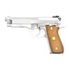 Cal. 9mm Parabellum. S# TJI60736. Bbl. 5". Manufactured September, 1990. Traditional double action. Alloy frame w/ stainless, serrated slide. Red dot front sight w/ aftermarket adjustable rear target sight. Polished finish on all exposed surfaces except top of slide which is a bead blasted matte finish. Ambidextrous thumb safety. Left side controls except magazine release w/ has been set up on right side. Serrated front & rear strap w/ bottom lanyard loop. Smooth hardwood grips w/ gold medallion. MAGS: 2 stainless 17 rd. UNATTACHED ACCESSORIES: factory foam packaging w/ cardboard sleeve, brush & paperwork. CONDITION: no obvious finish blemishing. Grips have only a few light impressions. Accompanying invoice dated in 1991 stating pistol was returned for a recall notice where the barrel, slide & a spring was replaced. Bore is bright w/ strong rifling. Fire control mechanism appears to function correctly when cycled by hand. (22-3416/JZ). MODERN. $400-600.