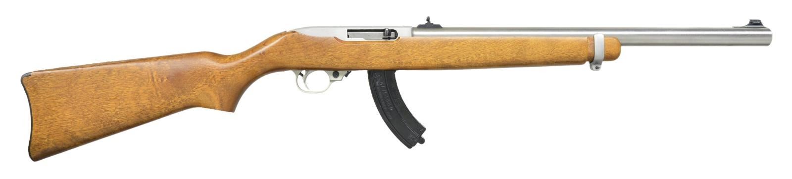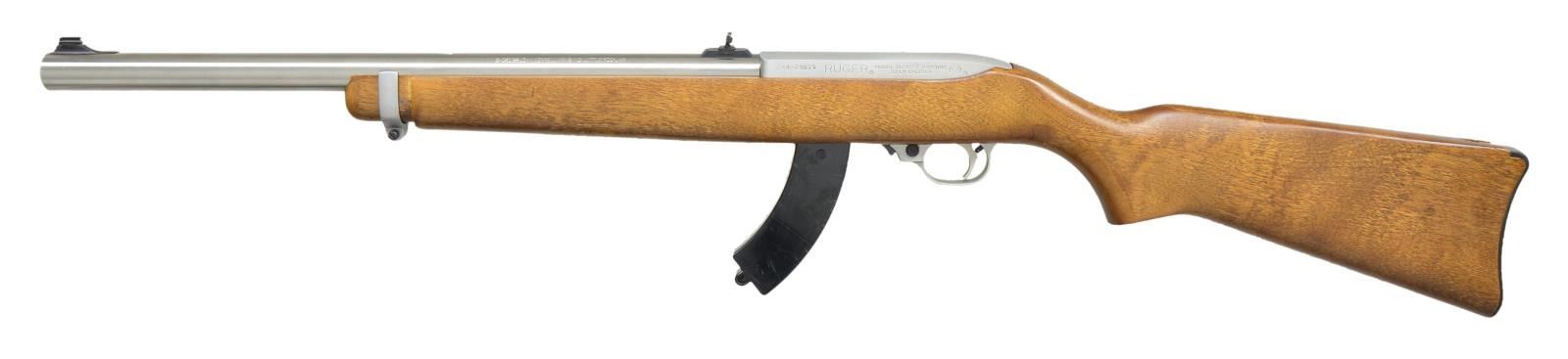 SURPRESSED RUGER 10/22 BY S&H ARMS & JOHN NORRELL. Cal. .22 LR. Silencer S# S0-080198, S&H Arms S# 2225, Ruger S# 244-29075. Bbl. 18". a beautiful stainless steel Ruger 10/22 converted to full auto & integrally suppressed utilizing John Norrell technology which is considered by many to be the bench mark in rim fire fast fire. Emulating a bull bbl. stainless steel target model. Outwardly, close inspection will reveal that the 18” bbl. Is actually an integral suppressor & the receiver bears the signature Norrell selector parallel w/ the trigger. Nestled in a modified Ruger factory hardwood stock as the ultimate illusion. Suppressed bbl. Also retains the factory Ruger sights consisting of a front blade & rear flip up buck horn, just like the original. Receiver is drilled & tapped for future optic mounting. Please be advised that this is a two stamp firearm, one for the MG & the other for the suppressor. MAGS: 1-30 rd. Ram-Line. UNATTACHED ACCESSORIES: black padded nylon number 40 Ace Case transport bag. CONDITION: factory wooden stock exhibits a few light impressions indicative of vertical rack storage. Finish on exposed metal surfaces is mostly unblemished aside from some gentle wear on top the receiver as can occur during storage. Bbl. Is shiny w/ strong rifling. Fire control mechanism appears to function correctly when cycled by hand. NATIONAL FIREARMS ACT MG/SUPPRESSOR REQUIRING BATF TRANSFER BEFORE TAKING POSSESSION. FULLY TRANSFERABLE. (03-1536 & 03-1537 & 22-218/JZ). MODERN CLASS III. $12,000-15,000.
