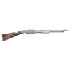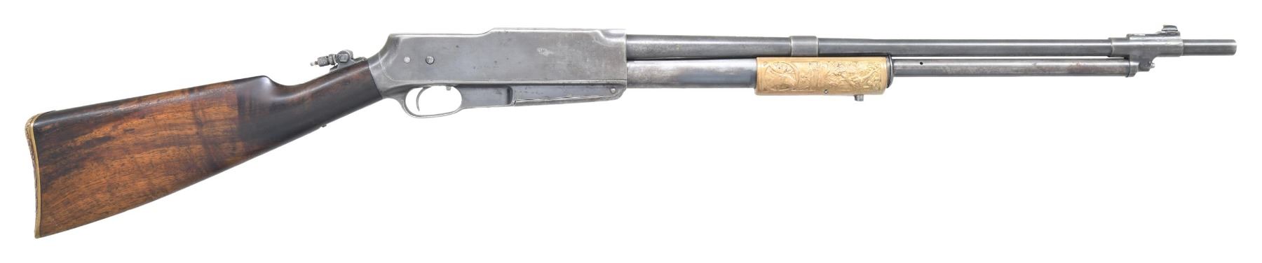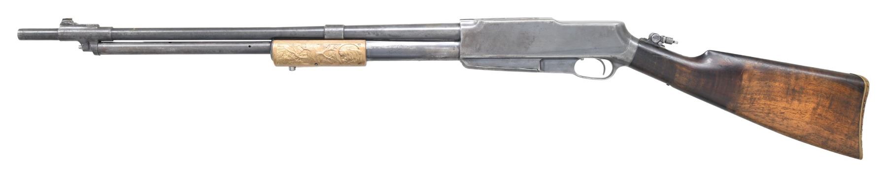 RIFLE. Cal. 30-30. S# 8295. Bbl. 22" rnd. Gas tube under bbl. is nearly full length, with a switch at gas port to allow semi-auto or manual slide action use. Ramp mounted bead front sight, with combination tang sight. Blue finish, with ornate brass slide handle. Straight grip stock of nicely grained walnut. Curved brass buttplate, with "SA" markings and oak leaf highlights. Mfg. 1909-1911. CONDITION: 50% dull fading blue, showing scattered surface corrosion and light pitting. Stock has age darkened worn appearance, with scratches, marks, and dents. Action will not cock and fire. Dark pitted bore. (25-2174/DS). CURIO. $500-800.