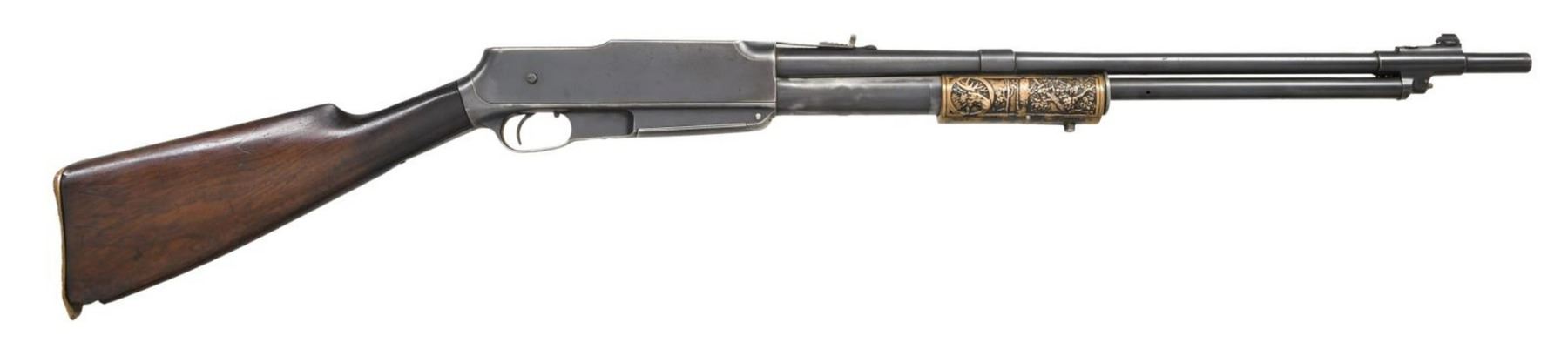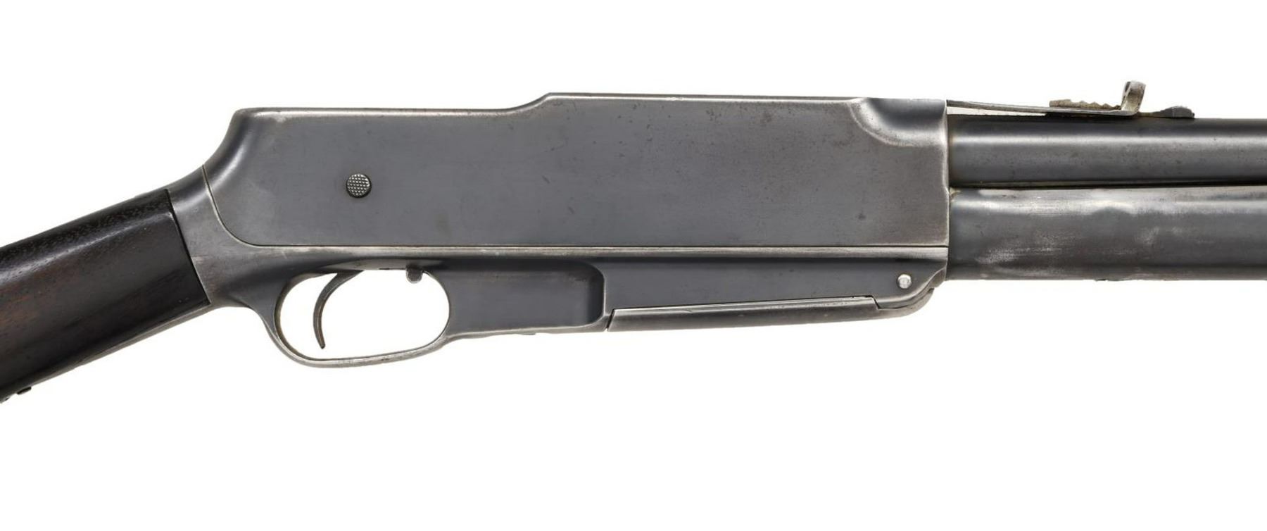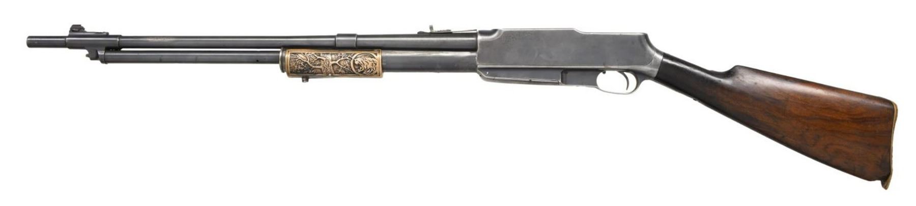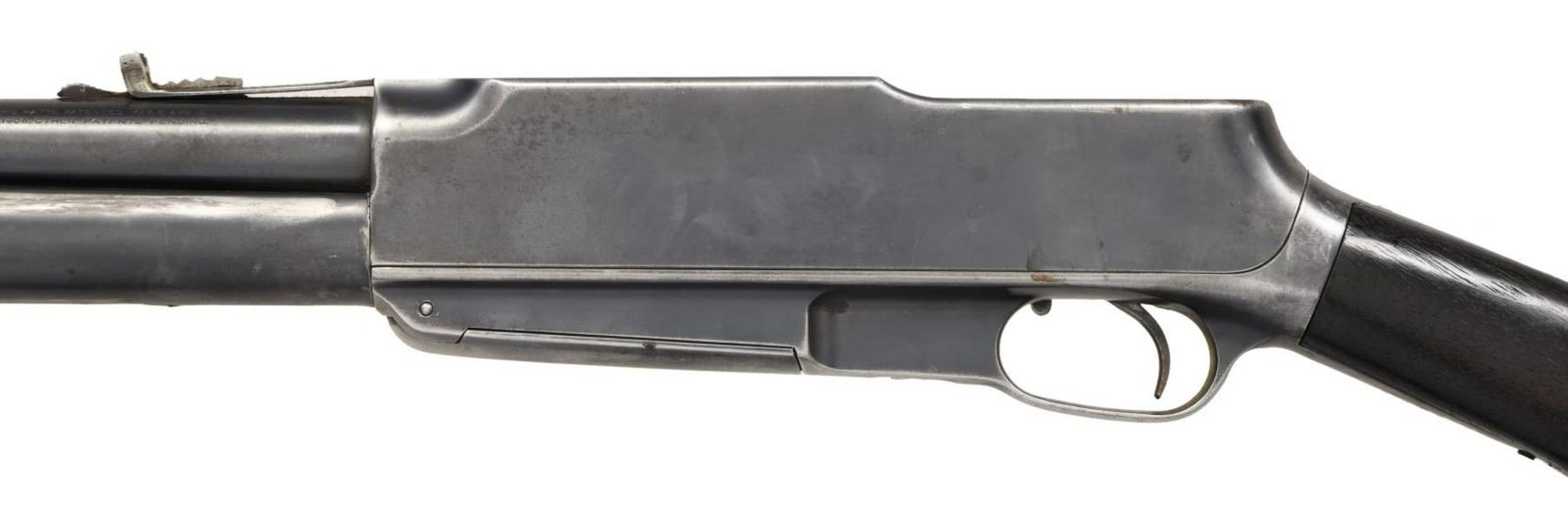 Cal. 30 Rem. S# 8834. Bbl 22 3/8". An unusual design, the Model G is a dual action rifle, allowing the operator to shoot in either pump action or semi-automatic firing modes. This example is marked "30 CAL" followed by Standard Arms' mfg. information over the top of the bbl., with patent information marked on the left. Blued receiver, bbl., and gas tube, with brass pump. Straight grip wood buttstock. CONDITION: metal components retain large amounts of their original factory blue finish, exhibiting areas of wear and thinning overall, with some areas of light pitting. Good bore, exhibiting pitting and strong rifling throughout. Brass pump retains a pleasing mellow patina. Stock shows some scattered marks from handling and storage, with a loss at the toe. (23-4733/MLW). CURIO. $300-500.