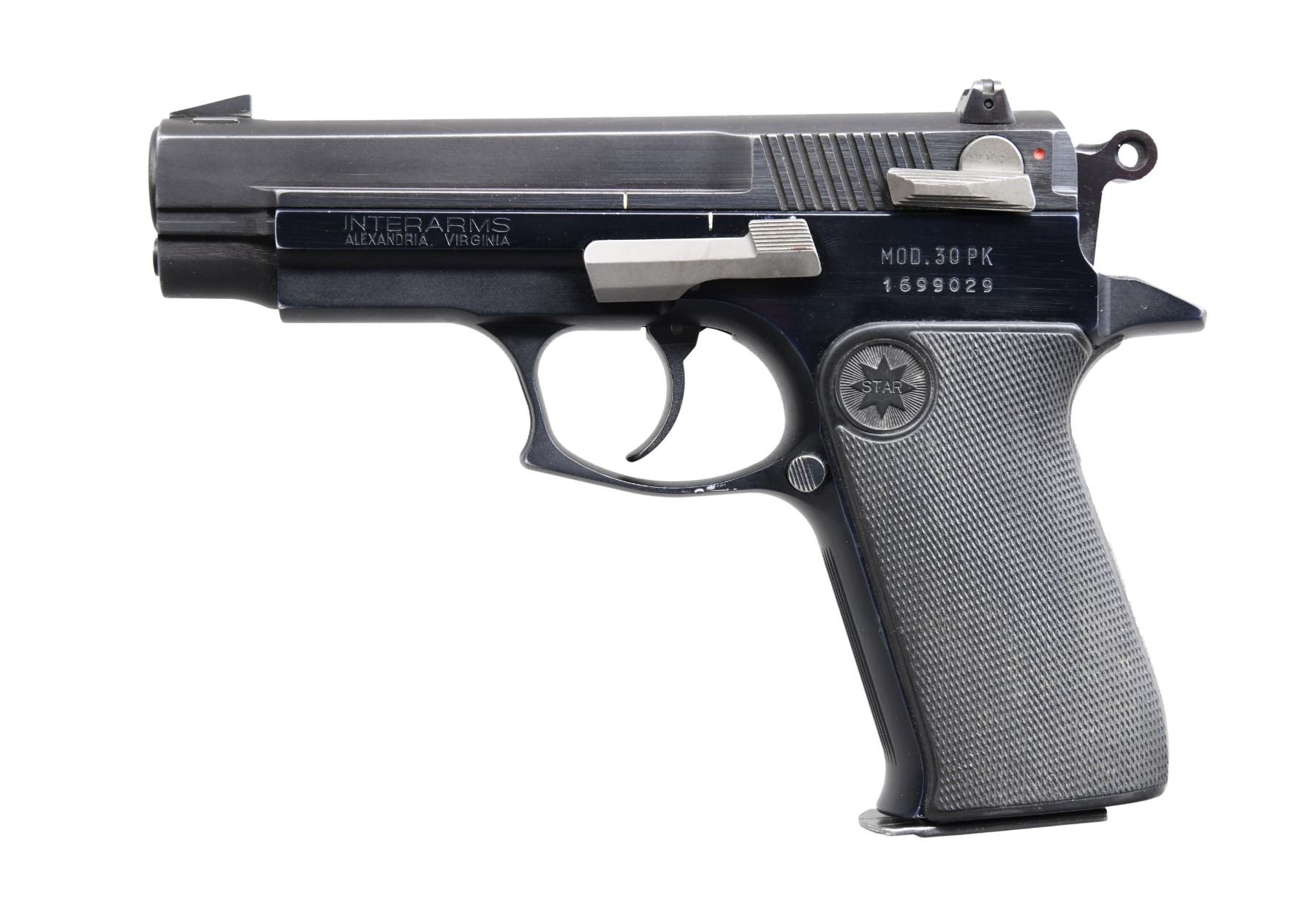 Cal. 9x19mm. S# 1699029. Bbl. 3 7/8". Model 30PK mfg. in Spain by Star and imported by Interarms. Left side of the frame is marked with Interarms importer information, as well as with the model designation and the S#, with the right side exhibiting Star's mfg. information above the cal. designation. Aluminum receiver exhibits a blue/black anodized finish, with remaining metal components exhibiting a matte gray finish. Frame is mounted with 2-piece checkered black rubber grips. Blade front sight, with square notch rear sight. MAGS: one 15-rd. CONDITION: metal components retain the majority of their original factory finishes, exhibiting some light to mild wear and thinning, as well as some scattered handling marks overall. Rear grip strap exhibits wear and thinning that shows through to a mostly gray patina. Near mirror bore, exhibiting what appears to be a couple small spots of light to mild pitting towards the breech while retaining strong rifling throughout. Grips show some mild wear but otherwise remain sturdy and serviceable. PROVENANCE: from the lifelong collection of Bill Peterken. (24-6099/MLW). MODERN. $250-350.