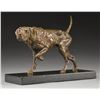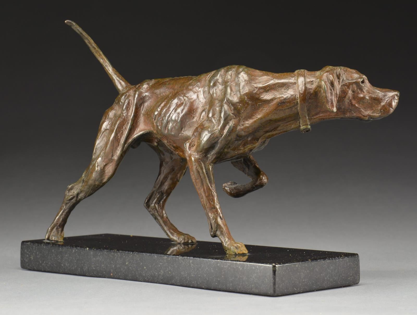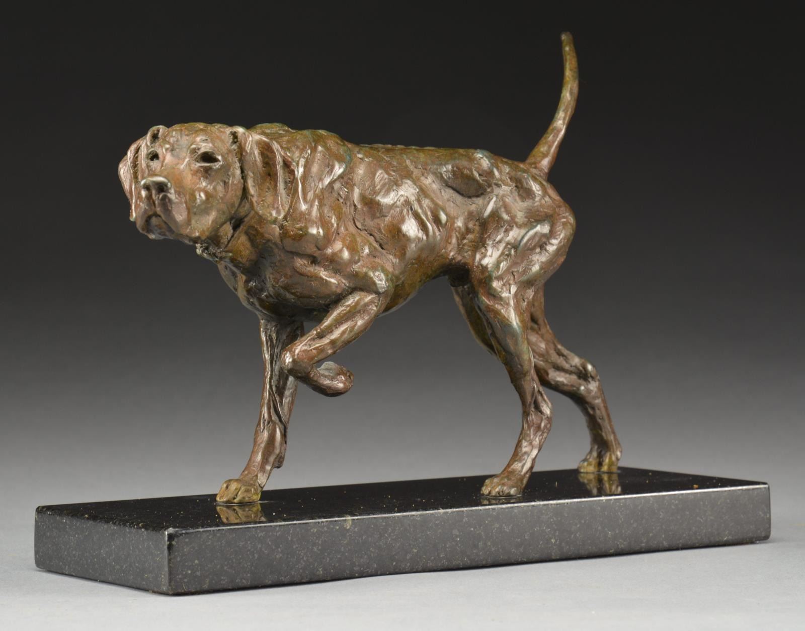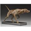 Dog on point bronze showing great detail. Sculpture is mounted on 10"x3 1/2" marble base. Statue is 7 3/4". Weight: 9 lbs. Mick Doellinger has focused on animal sculptures during his 35 year career, the subtle nuances, shape, motion & character of his art leaves the viewer "feeling the essence of the animal". CONDITION: fine overall. (02-16547/DS). $500-1,000.