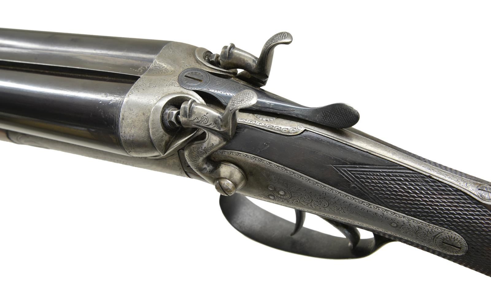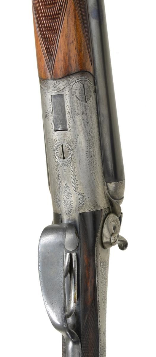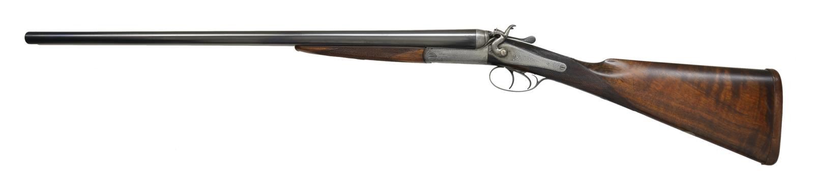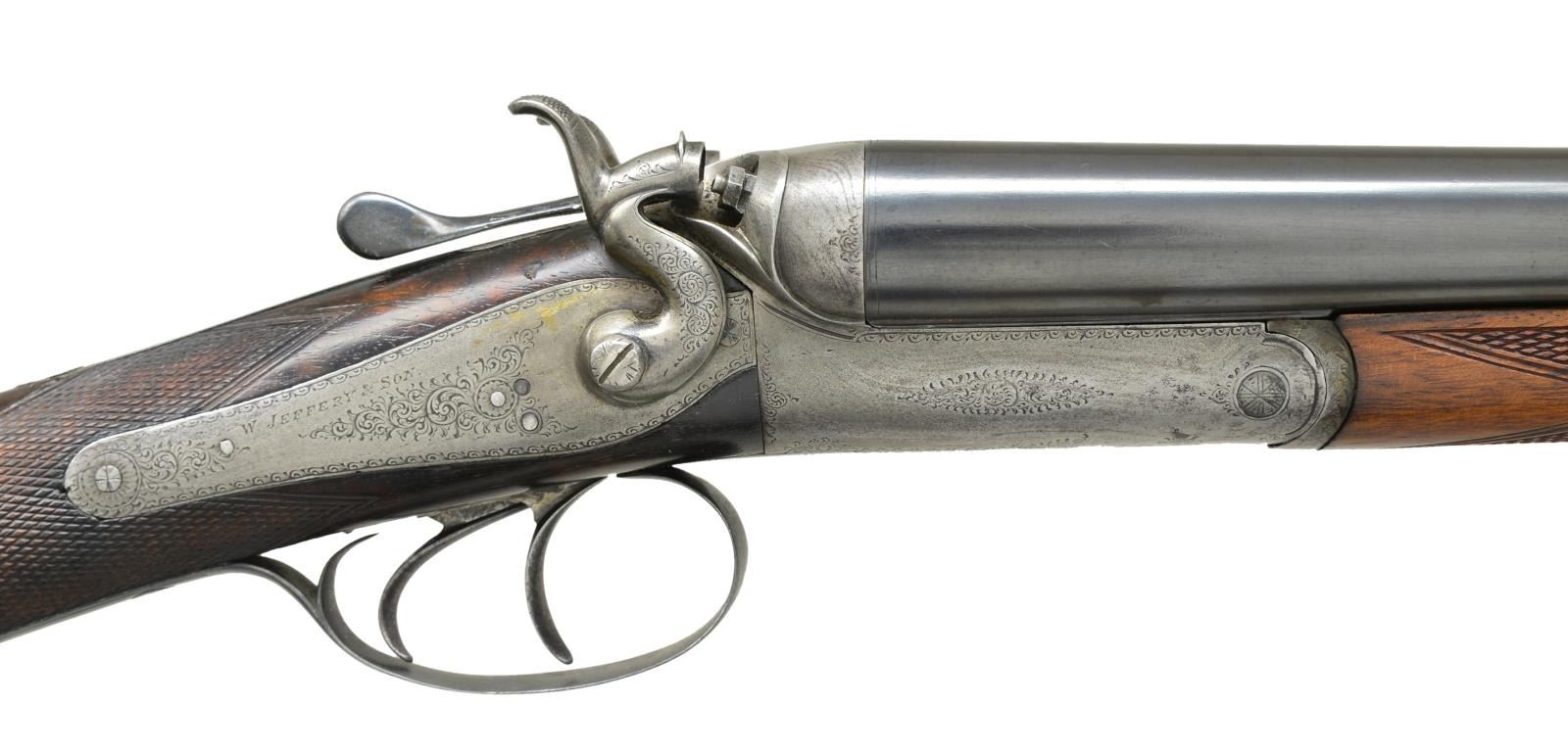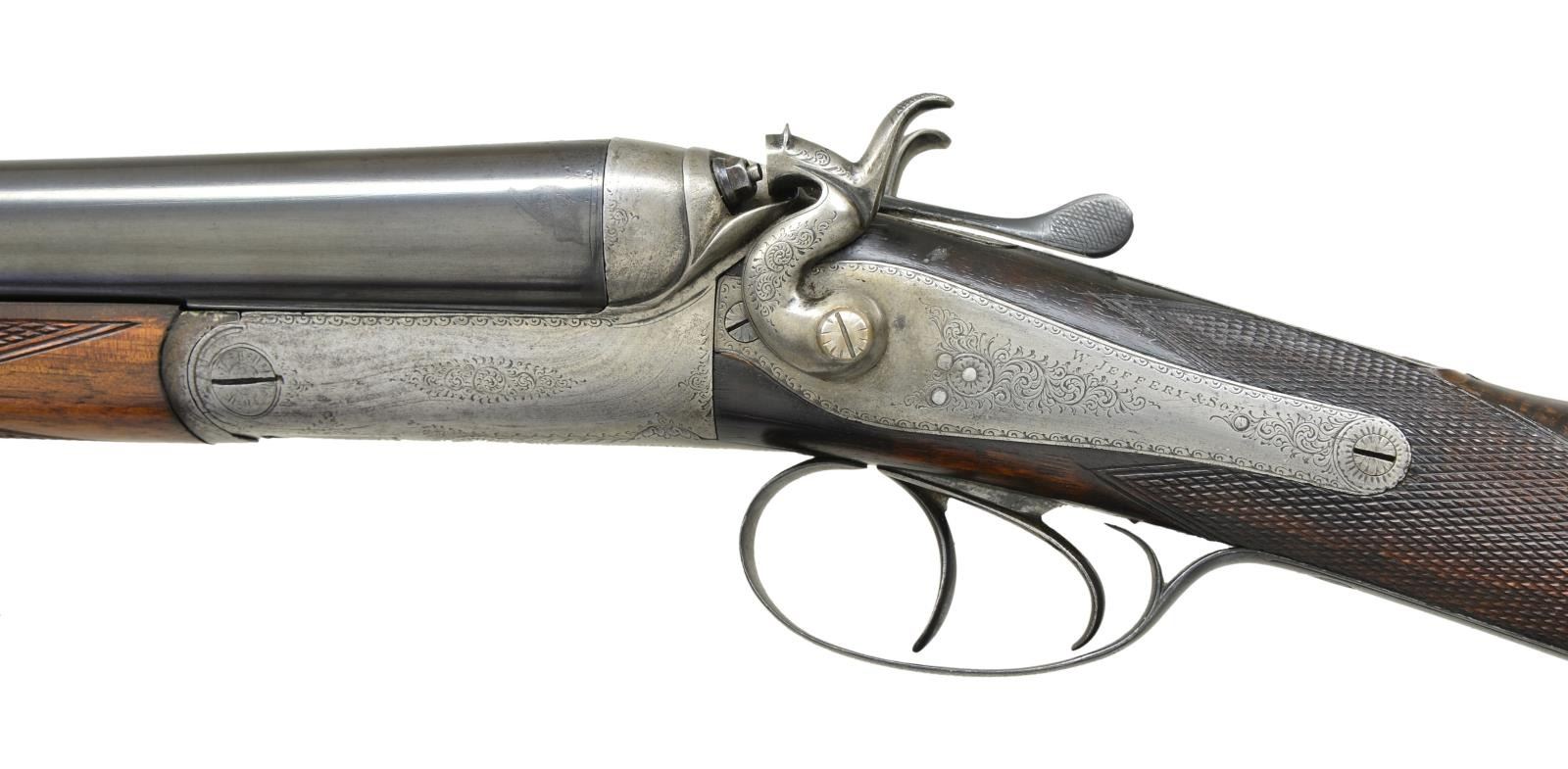 Cal. 12 Ga., 2 5/8". S# 1254. The 28" bbls. w/ swamped game rib are unmarked. Bbl. flats stamped w/ Birmingham nitro proofs for 2 1/2" chambers & Birmingham reproofs also for 2 1/2". Rnd. bodied top lever action fitted w/ back spring, peninsula locks w/ rnd. bodied serpentine rebounding hammers. Action & locks engraved w/ 30% coverage varying size scroll w/in line & scroll borders. "W. Jeffery & Son" is on each plate. Straight grip buttstock of well figured & lightly streaked European walnut measures 14 5/8" over brown leather covered pad. Point pattern checkering is at grip & a vacant silver oval is on toeline. Matching splinter forend has spring tension release. MEASUREMENTS: bbls.: bore diameter: right: .735", left: .729". Restriction: right: .014" (MOD), left: .011" (IC). Minimum Wall Thickness: right: .035", left: .040". STOCK: DAH: 1 7/8". DAC: 1 7/16". LOP: 14 5/8". CAST: 0. WEIGHT: 6 lbs. 13 oz. CONDITION: good as partially refinished. Bbls. w/ nearly all of an old good quality reblack. Action & locks cleaned to pewter gray. Top lever & trigger guard reblued. Engraving quite washed out. Stocks retain nearly all of an old oil refinish w/ scattered marks. Checkering recut. Bores are bright & shiny. Action is tight. Bbls. somewhat off face. Locks are good. (01-20306/MGM). ANTIQUE. $1,000-1,500.