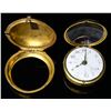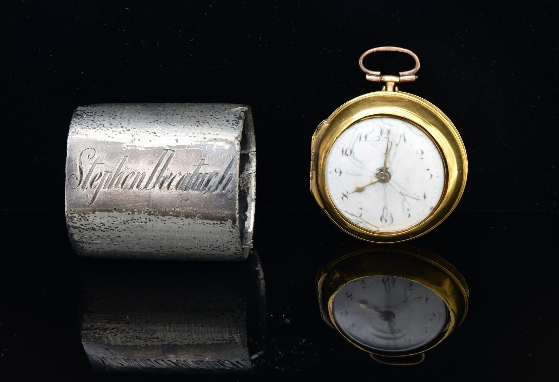 Early fancy Fusse pocket watch in double gold case, London assay hallmarked case for 1777. Movement engraved "Peacock 3847, Royal Exchange London". The watch has an attached old ink inscription on Stephen Decatur calling card, it reads: "Thomas Ten Eyck's watch which my father Commodore Stephen Decatur [1752-1808] always wore and although blind, he could always quickly tell the time by sense of touching the hands with his fingers". Thomas Ten Eyck (1742-1808) daughter, Marie Susana married Commodore Stephen Decatur, Jr (1779-1820) brother Colonel John Pine Decatur (1786-1832). Wealthy men of this era carried these first Fusse watches with these elaborate complex mechanisms that kept best time possible. Watch appears complete and mechanism may work, but is sold as-is, both hands intact, white enamel dial has several cracks. Also include in lot is 2" oval silver plated napkin ring inscribed "Stephen Decatur Jr", large cut on edge and scratches. PROVENANCE: James D. Julia Auctioneers, lot 3133, August 27, 2009; Martin Lane Historic & Western Americana Lifetime Collection. (02-21461/JS). $2,500-3,000.