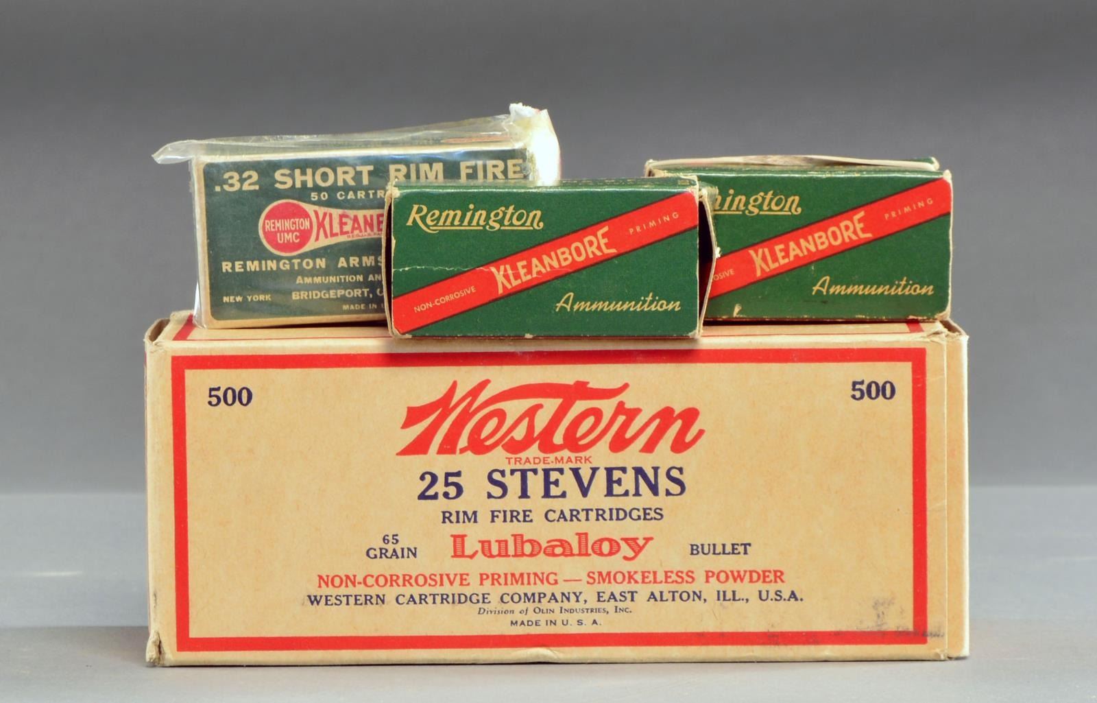 Full brick (10 boxes of 50 rds.) of Winchester Western 25 Stevens Long having stock #25ST & 65 grain bullets. Individual boxes are blue / yellow w/ red & black writing. Brick is cream colored w/ red borders. Spectacular time capsule of Winchester ammo in fantastic near excellent condition. 2 boxes of Remington Kleanbore 25 Stevens Long (one box missing end flap w/ only 42 rds.) in near excellent condition. 1 box of Remington Kleanbore 32 Short RF in very good condition. (02-12464-82/NW). $750-1,000.