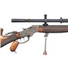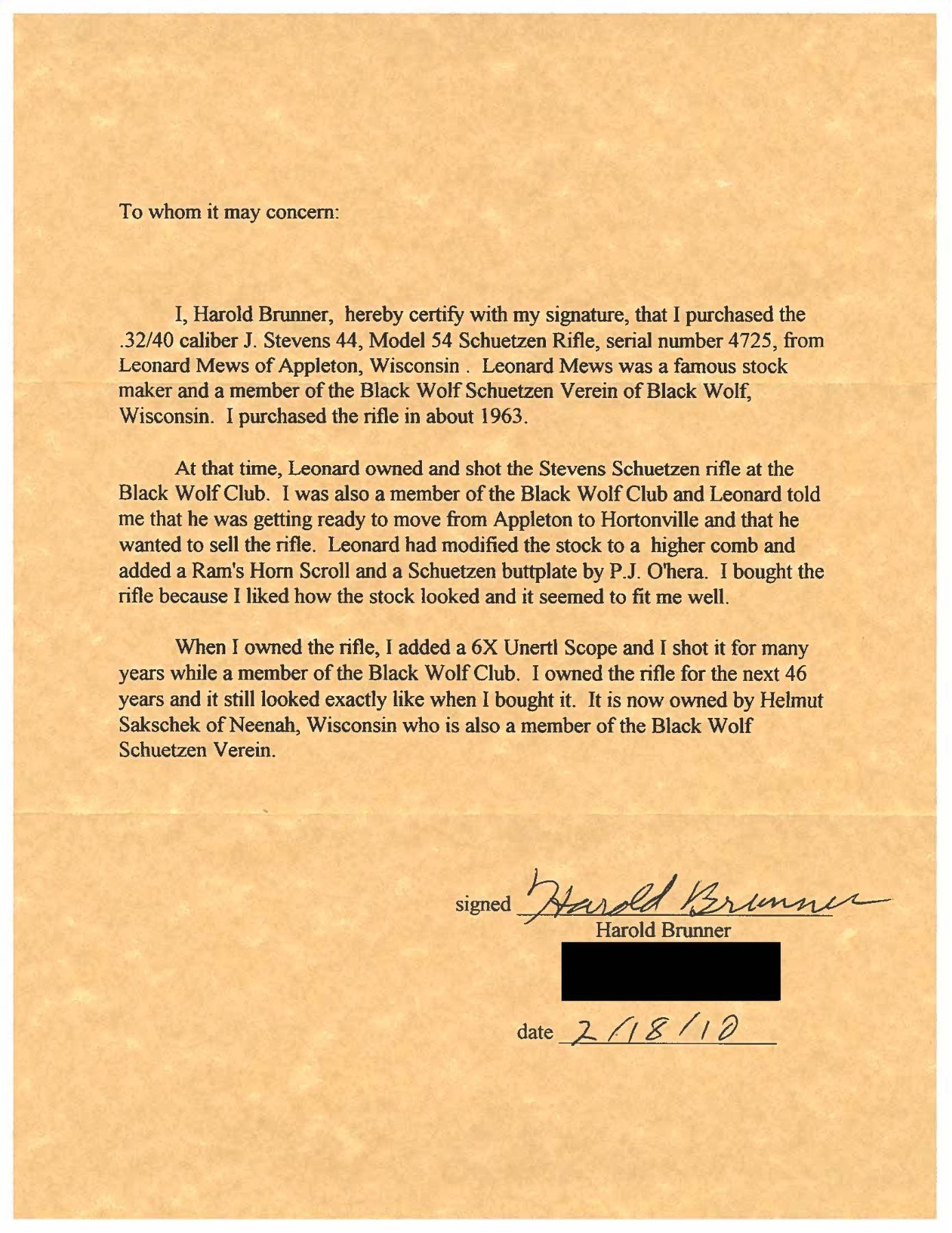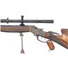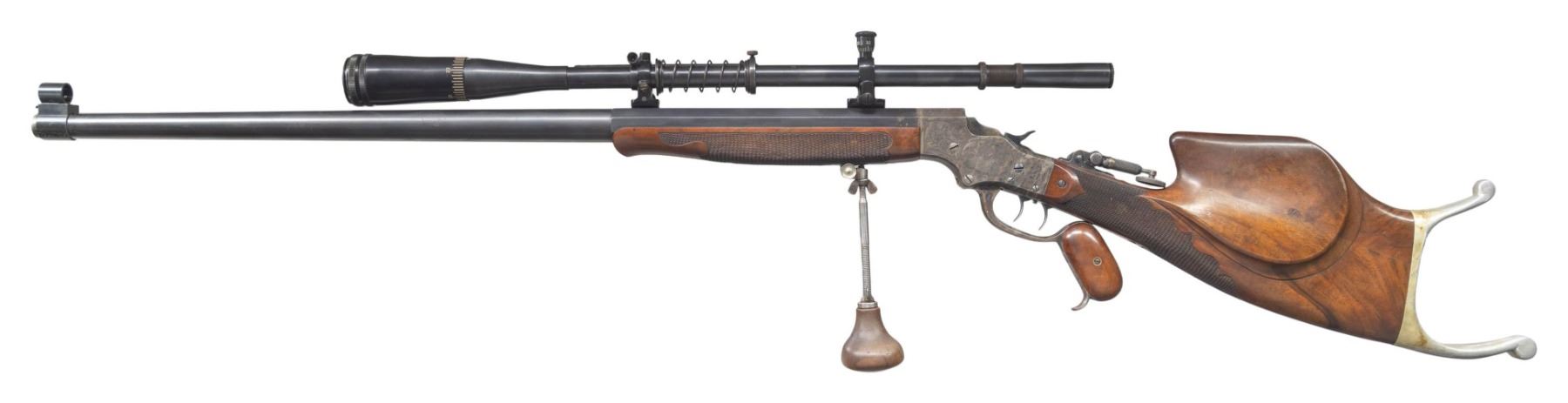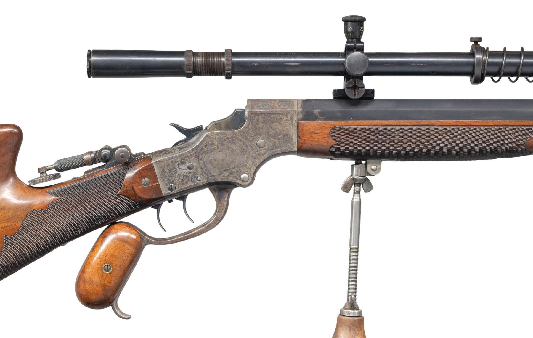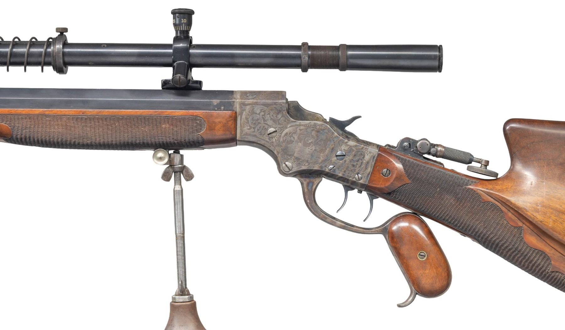 Cal. 32-40. S# 4725. Bbl 30" oct to rnd. Bbl band mounted globe front sight with combination tang sight having a large disk aperture. Lyman Super Target Spot 20 power scope with crosshair reticle. Scope has external adjustments and is mounted on bbl blocks. Model 54 Schuetzen Special built on the Model 44 action. Receiver has generous coverage of vine type scroll engraving with oval scenes on both sides. Features include dbl set triggers, finger curl lever with walnut grips. Case colored finish. Schnable tipped walnut forearm and original perch belly cheekpiece stock with elaborate borderless hand checkering. Stock is cut and spliced with a higher than standard comb by famous stock maker Leonard Mews. Right side of comb extension has a carved swirl leading into flutes along the rear edge of the comb that flow into a molded border around the bottom of the cheekpiece. LOP: 13" to an aluminum Swiss style Schuetzen buttplate having unusually wide lower prong. Forearm is fitted with an added palm rest having a walnut knob. WEIGHT: 13lbs, 9.2oz. The No. 54 rifle; Steven's highest grade was manufactured 1897-1916. UNATTACHED ACCESSORIES: included is a letter from a previous owner stating that he purchased the rifle in 1963 from Leonard Mews; the famous stock maker from Wisconsin. Rifle is housed in a modern foam lined plastic carrying case. CONDITION: bbl retains over 80% reblued finish showing light edge wear with spotted finish loss. Action has over 80% lightly faded case colors. Stock and forearm have good finish and checkering. Wrist of stock is cracked and has a bolt-style repair. Sound action and trigger. Bore has lightly worn rifling with some darkening in the grooves. Scope has clear optics. PROVENANCE: From the Buckstix Collection. (25-6513/DS). CURIO. $4,500-6,500.