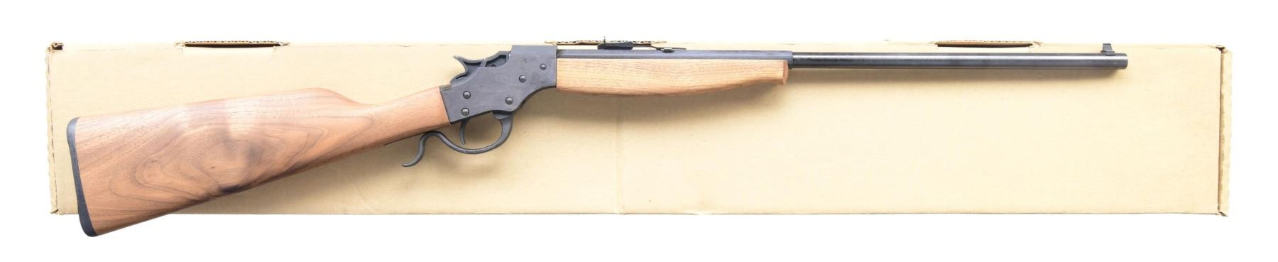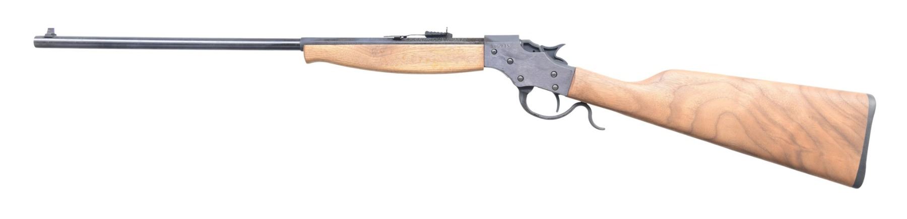 Cal. 22 LR. S# 800915. Bbl. 21", part rnd., part oct. Bead front sight. Sporting-style rear sight. Modern Savage Stevens Favorite rifle, mfg. in Canada. Matte blue finish. Hardwood stock set. UNATTACHED ACCESSORIES: matching-numbered factory box with manual, paperwork, and trigger lock. CONDITION: all aspects are near excellent. PROVENANCE: the estate collection of Charles Wagner. (24-4676/MJC). MODERN. $200-300.