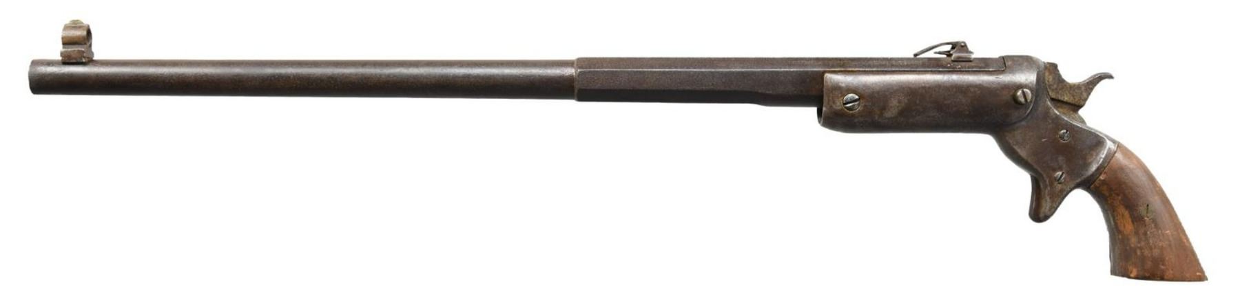Cal. 22 LR. S# 2732. Bbl. 18 1/8". New Model Pocket Rifle mfg. by Stevens. The left quarter flat of the half octagonal bbl. is marked with Steven's mfg. information. Metal components exhibit a dark gray patina. Frame is mounted with 2 piece aftermarket wood grips. Globe/brass blade front sight is missing its post and rear sight is missing its slide. CONDITION: metal components exhibit a dark gray patina, with pitting overall. Pitted bore, exhibiting fair rifling throughout. Grips show scattered marks from handling and storage, but otherwise remain sturdy and serviceable. Rear sight ladder is bent. (23-5686/MLW). CURIO. $100-200.