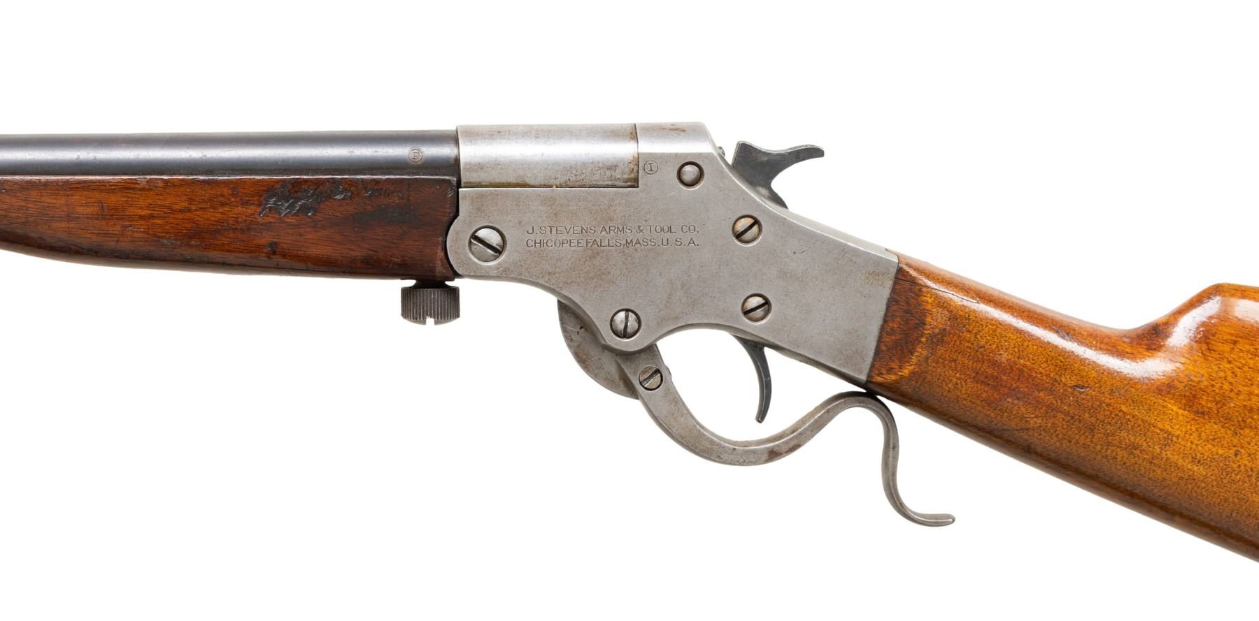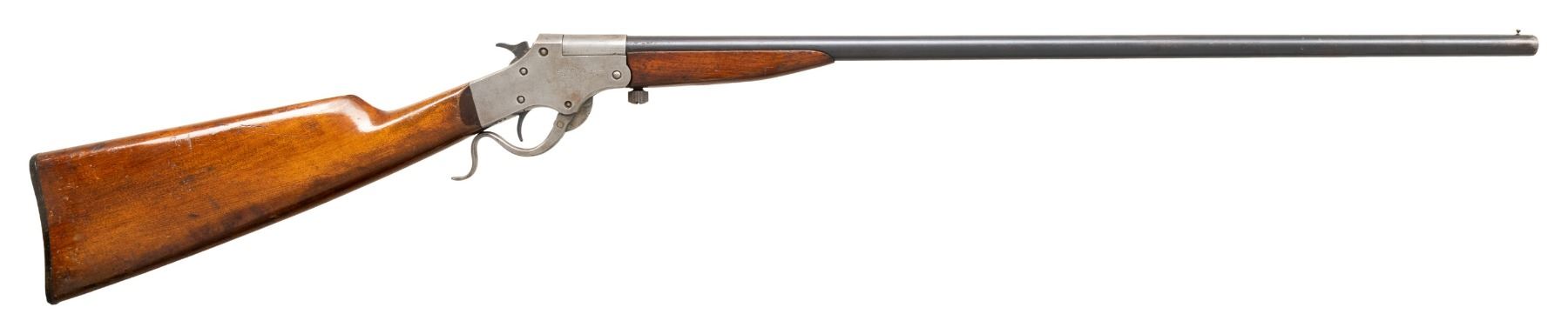 Cal. 44 Shot. S# I244. Mfg. 1914-1920 on a No. 12 Marksman frame as a smoothbore rifle for the 44 XL Shot cartridge. Bbl. 26" w/ brass bead. Tip Up action w/ takedown screw for barrel. Walnut stock set w/ curved buttplate. CONDITION: fair fading barrel blue mixing with brown patina. Receiver has cleaned gray appearance re-acquiring patina. Wood has old added finish w/ peeling along edges, cracks & marks. Bore shows light pitting forward of chamber. PROVENANCE: Estate of Groves Herrick. (25-5668/MD). CURIO. $200-300.