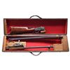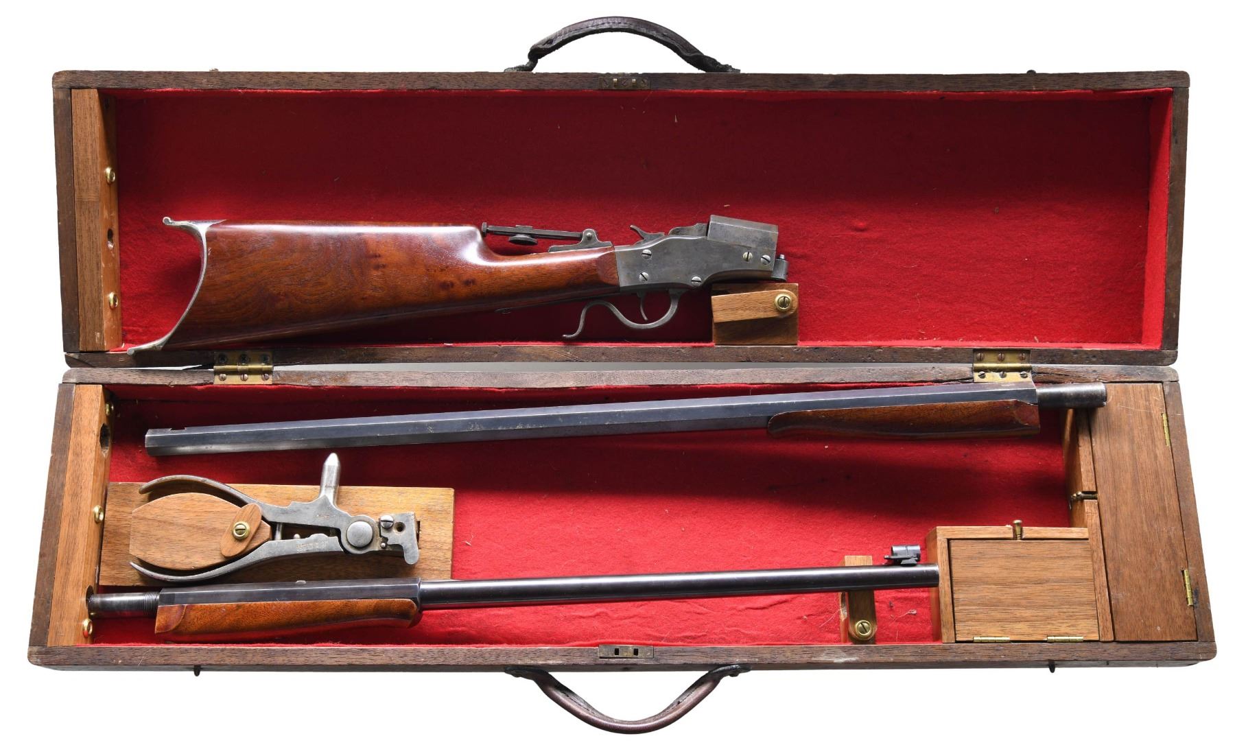 RIFLE 2 BARREL SET. Cal. 25-20 & 22LR. S# 309. Mfg. 1893 to mid 1894 as Stevens first under lever single shot rifle. Barrel (1) is half oct. & half rnd. 24" with combination front sight & filler rear dovetail. Barrel (2) Oct. 28.25" with partially restamped patent date on barrel. Falling block action with 5 screw removable side plate on right side, mid size vernier tang sight & "S" curved lever. Walnut schnabel tipped forearms & straight grip buttstock with nickeled Schutzen style buttplate. UNATTACHED ACCESSORIES: walnut luggage case with red velour interior. Case contains combination front sight for barrel 2, case fixture for barrel 2. Case shows marks & large crack on bottom portion. CONDITION: Barrel 1 is reblued over prior marks & noticeable impression to bottom edges; bore shows wear to lands & light pitting. Barrel 2 has fair blue finish with wear, scratches, marks & peppery oxidation; bore shows wear to lands & some shine. Receiver shows gray patina appearance with pitting & oxidation. Wood shows good finish with handling marks. (01-26521/MD). ANTIQUE. $400-600.