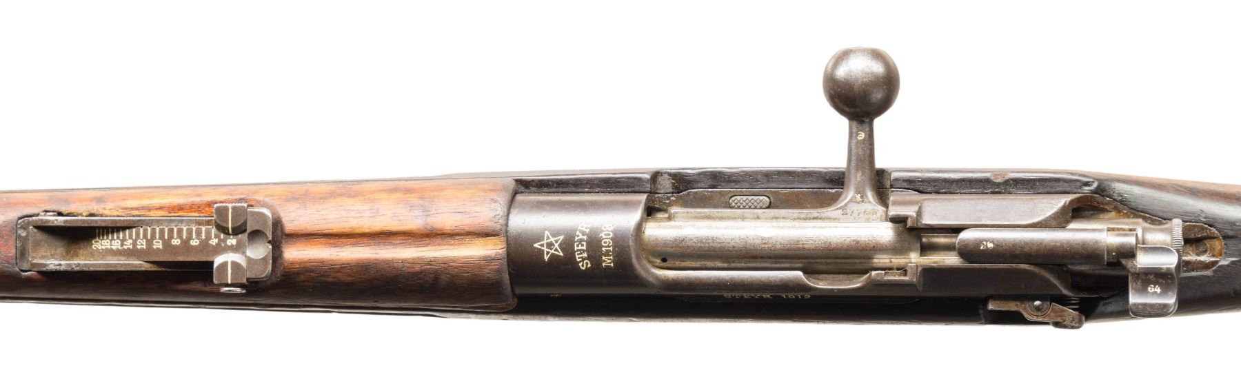 MILITARY RIFLE. Cal. 6.5x54 MS. S# 1761. Bbl. 29". Blade front sight. Tangent rear sight graduated to 2000m. Bolt & stock are both mismatched. Unusual Mannlicher-Schoenauer military rifle without Greek acceptance markings on metal. Receiver ring marked "STEYR M1908" with five pointed star & white highlight. Left side of receiver has circled "T" firing proof" & "STEYR 1912" date all with white highlight. Arsenal blue finish. Hardwood stock set with bottom mounted sling swivels. Top of wrist has faint St. George cartouche & left side of butt has partly faded Greek acceptance stamp. No cleaning rod present. CONDITION: stock shows an old refinish with some chipping, scattered dings, handling marks, scratches & a few gouges. Metal shows a fading old arsenal reblue with heavy pitting patches on bbl., further scattered pitting, oxidation, edge wear, handling marks & strong traces of arsenal blue. Action functions properly when hand cycled. Dark worn bore with pitting & oxidation along its length. PROVENANCE: From the PMRB Collection.(25-5950/MJC). CURIO. $400-600.