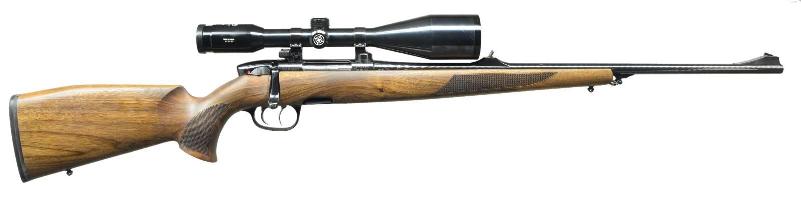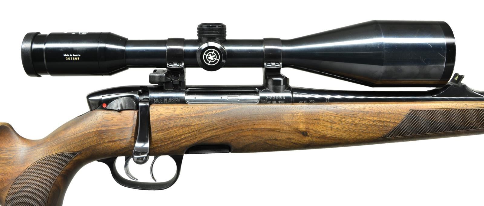 RIFLE. Cal. 223 Rem. S# 212054. Bbl. 23 1/2" hammer forged. Windage adj. open rear sight. Ramp front sight w/ blade adj. elevation. Receiver fitted w/ quick detachable 2 piece scope bases & "KARL KALHES / HELIA S" 8X56 scope w/ European style pointed post & heavy cross bar reticle. Receiver is marked on left side w/ Steyr logo & "STEYR MANNLICHER - SL". Marked on right side of receiver bridge "MADE IN AUSTRIA". Bbl. marked underneath by sling swivel "TGGI MOBILE AL". Flat bolt handle; sliding safety on right rear of receiver. Double set triggers. Checkered walnut stock w/ European cheek piece; black solid pad. Stock is fitted w/ QD swivel bases. Bbl. fitted w/ swivel just forward of plain tip forend. MAGS: 5 shot synthetic rotary mag. UNATTACHED ACCESSORIES: plastic Zeiss scope caps modified for clearance between objective bell & rear sight. CONDITION: rifle shows very little use w/ very light scattered high point wear. Scope shows several fine scratches & scattered handling marks w/ notable abrasion on left side of objective bell. Optics are clear & serviceable. Very good shiny bore w/ sharp lands.